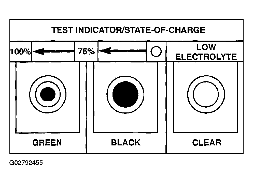 - Green - Indicates 75% to 100% battery state-of-charge. The battery is adequately charged for further testing or return to service. If the starter will not crank for a minimum of fifteen seconds with a fully-charged battery, the battery must be load tested. Refer to STANDARD PROCEDURES for the proper battery load test procedures.