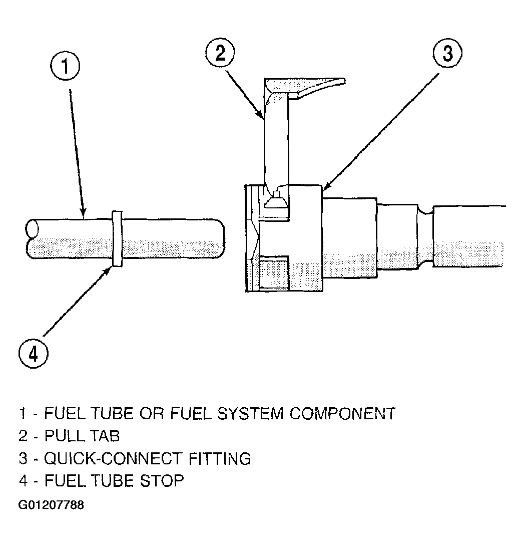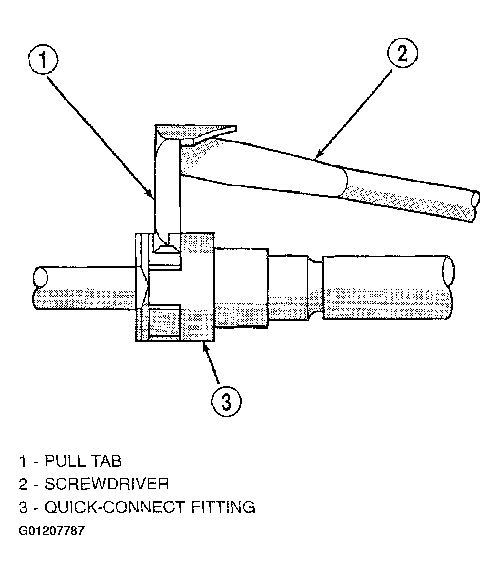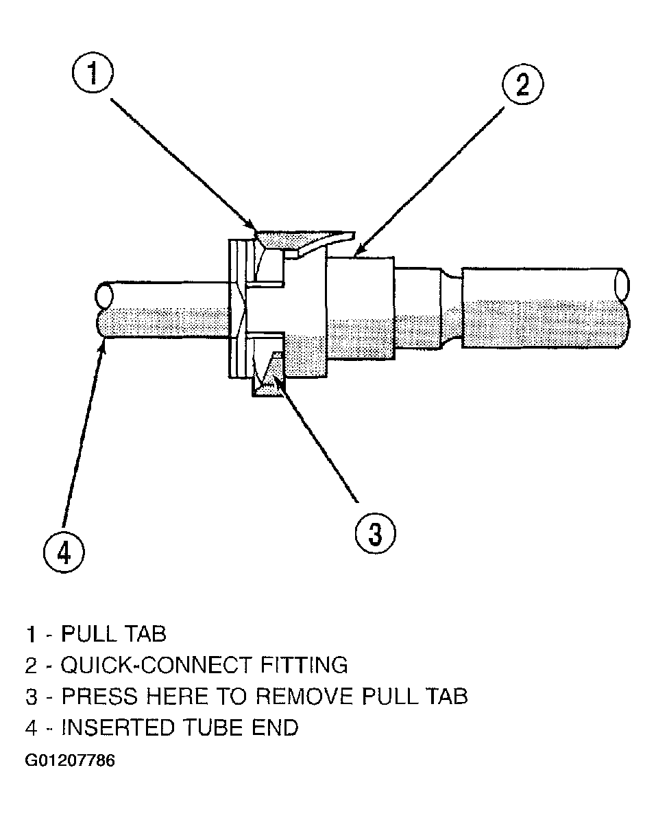 This type of fitting is equipped with a single pull tab. See Fig 2. The tab is removable. After tab is removed, quick-connect fitting can be separated from fuel system component.