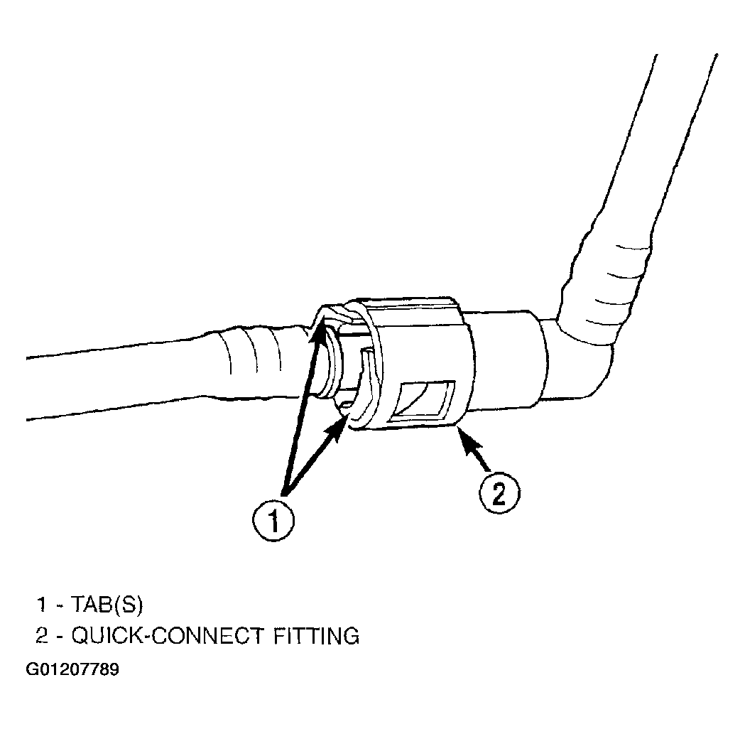This type of fitting is equipped with tabs located on both sides of fitting. See Fig 5. The tabs are supplied for disconnecting quick-connect fitting from component being serviced.