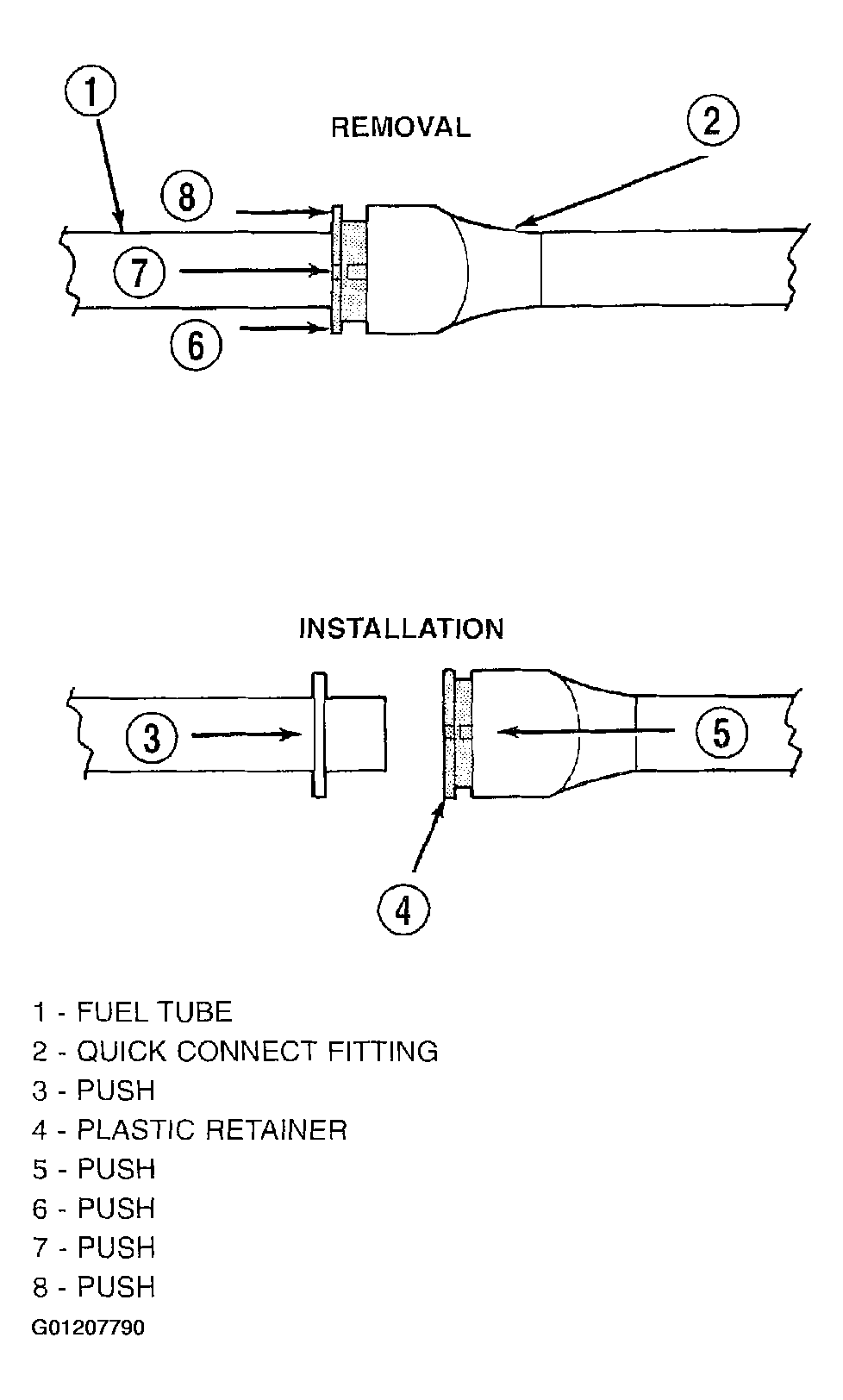 - To release fuel system component from quick-connect fitting, firmly push fitting towards component being serviced while firmly pushing plastic retainer ring into fitting. See Fig 6. With plastic ring depressed, pull fitting from component. The plastic retainer ring must be pressed squarely into fitting body. If this retainer is cocked during removal, it may be difficult to disconnect fitting. Use an open-end wrench on shoulder of plastic retainer ring to aid in disconnection.