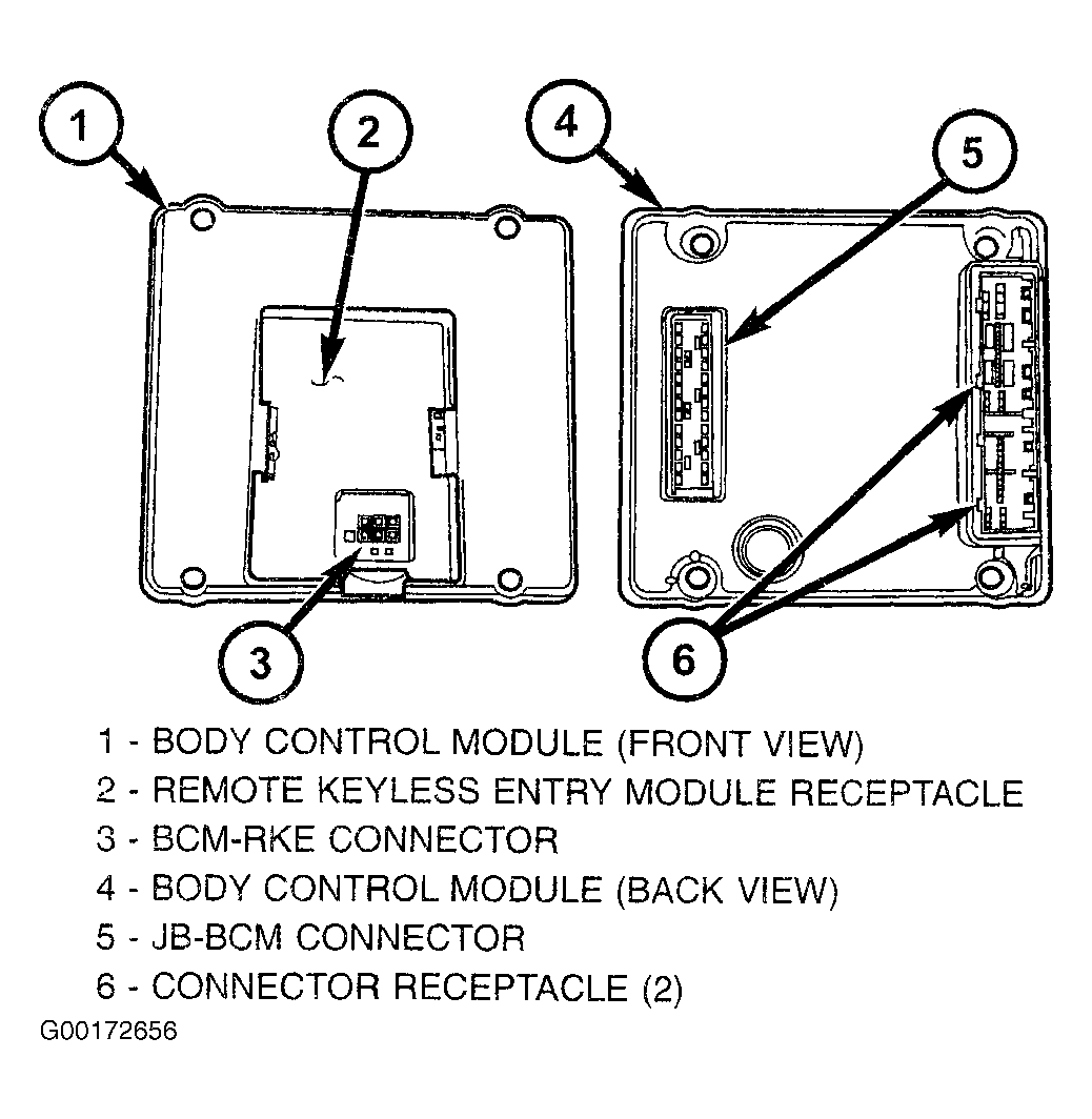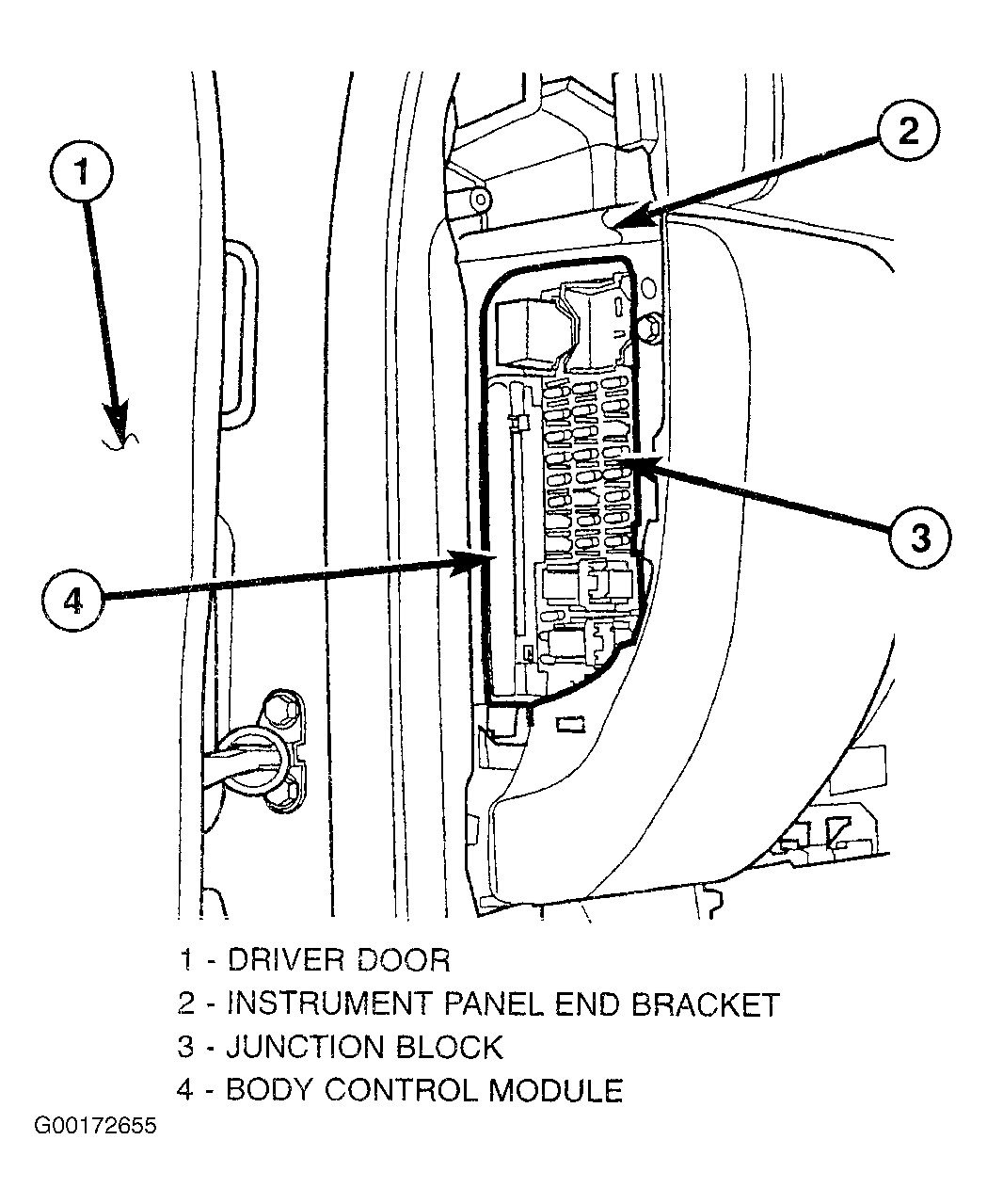 A Body Control Module (BCM) is concealed behind the driver side end of the instrument panel in the passenger compartment, where it is secured to the fuse panel side of the Junction Block (JB) with 4 screws. See Fig 1 . The JB is the interface between the body, the instrument panel, and the headlamp and dash wire harnesses. The JB also contains the fuses and relays used for the interior electrical system of the vehicle. The BCM is enclosed in a molded plastic housing with two integral external connector receptacles that connect it to the vehicle electrical system through two take outs with connectors from the instrument panel wire harness. See Fig 2 . The BCM also has an integral interface connector concealed on the back side of the unit that joins it through a connector receptacle that is integral to the JB housing to the circuitry within the JB. This connector is referred to as the JB-BCM connector. The combined BCM and JB are sometimes referred to as the Junction Block Module (JBM). There are two different versions of the BCM: base and premium. The base BCM is a subset of the components in the premium version. Basically, the base version BCM does not support the following features: Compass Mini-Trip Computer (CMTC), fog lamps (front and/or rear), Remote Keyless Entry (RKE), remote radio switches, or Vehicle Theft Security System (VTSS). Both versions of the BCM utilize integrated circuitry and information carried on the Programmable Communications Interface (PCI) data bus network along with many hard wired inputs to monitor many sensor and switch inputs throughout the vehicle. In response to those inputs, the internal circuitry and programming of the BCM allow it to control and integrate many electronic functions and features of the vehicle through both hard wired outputs and the transmission of electronic message outputs to other electronic modules in the vehicle over the PCI data bus.