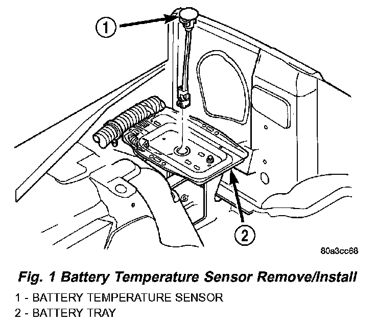 The battery temperature sensor is located under the vehicle battery (Fig. 1) and is attached to a mounting hole on battery tray.