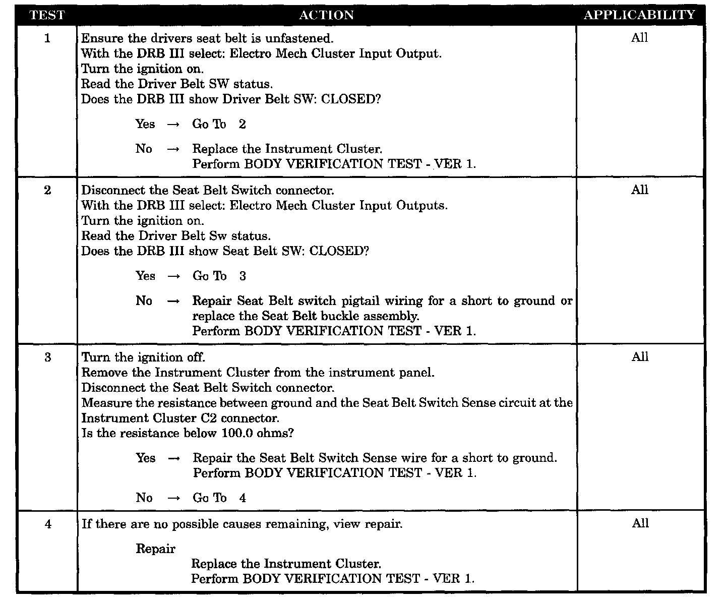 Home >> Jeep >> 2002 >> TJ (CANADA) L4-2.5L >> Repair and Diagnosis >> Powertrain Management >> Computers and Control Systems >> Relays and Modules - Computers and Control Systems >> Body Control Module >> Testing and Inspection >> Symptom Related Diagnostic Procedures >> Chime Inoperative With Drivers Seat Belt Unfastened