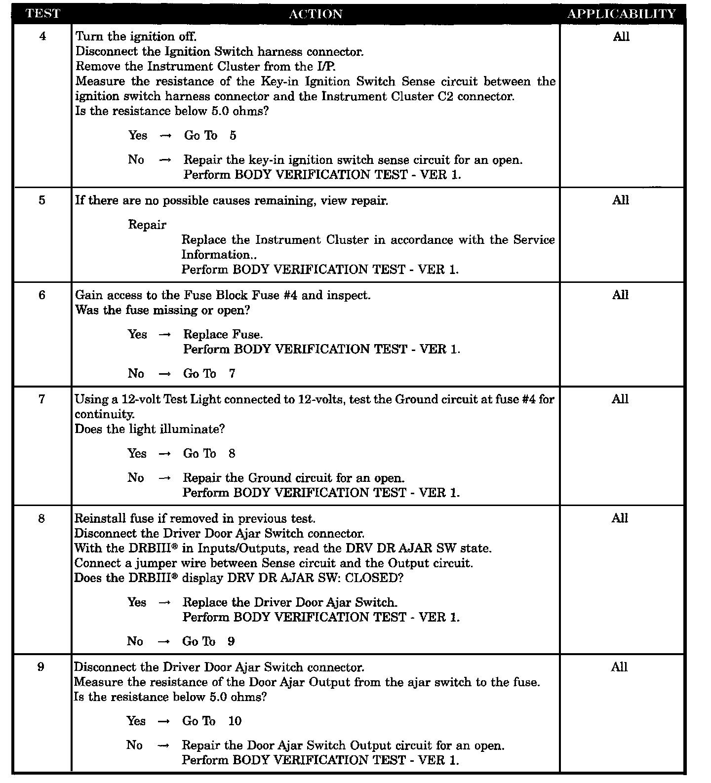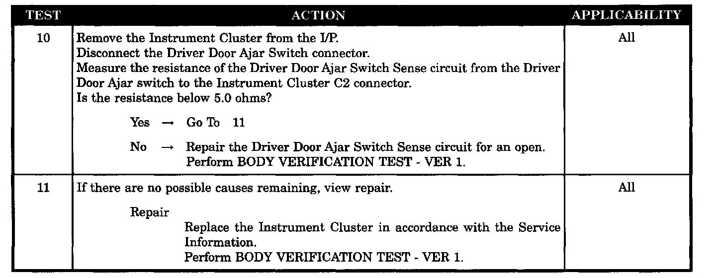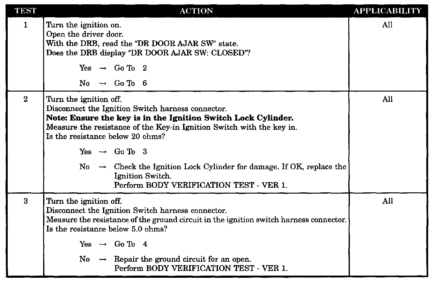 Home >> Jeep >> 2002 >> Wrangler L6-4.0L VIN S >> Repair and Diagnosis >> Powertrain Management >> Computers and Control Systems >> Relays and Modules - Computers and Control Systems >> Body Control Module >> Testing and Inspection >> Symptom Related Diagnostic Procedures >> Chime Inoperative With Key In Ignition and Driver's Door Open