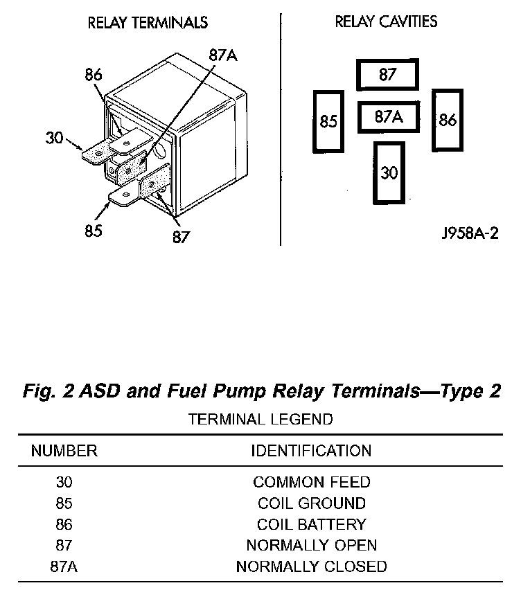 The following description of operation and tests apply only to the Automatic Shutdown (ASD) and fuel pump relays. The terminals on the bottom of each relay are numbered. Two different types of relays may be used, or.