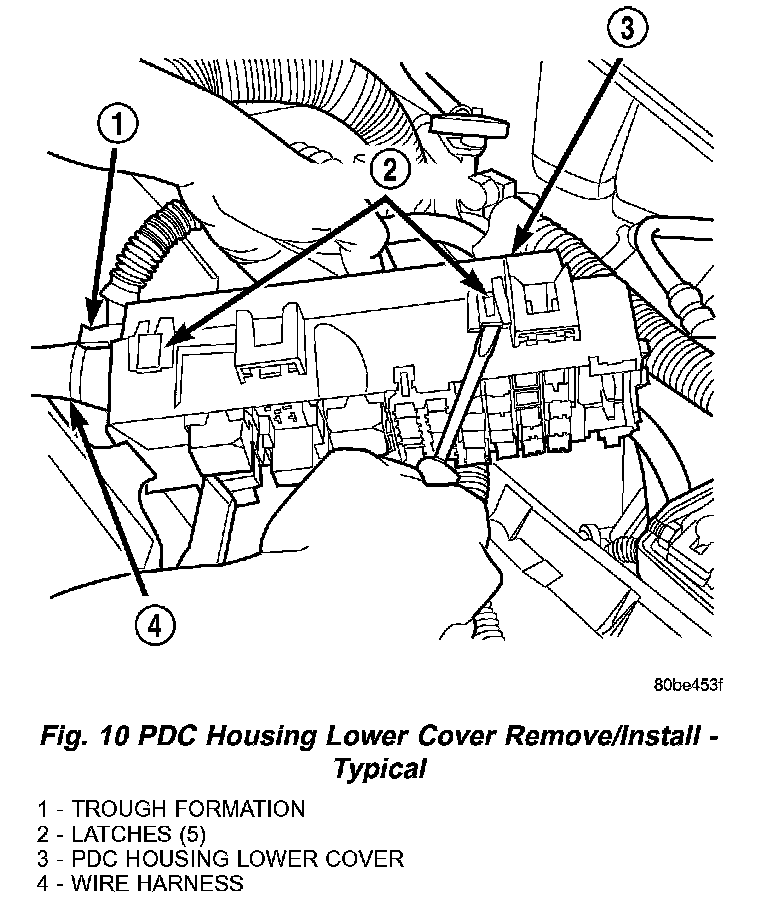 6. Where the right headlamp and dash wire harness exits the PDC, remove the tape that secures the wire harness to the trough formation on the PDC housing lower cover.