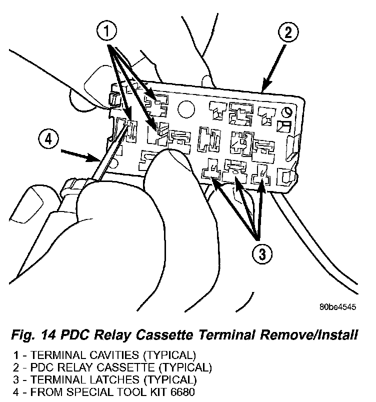 4. While pulling gently on the wire from the bottom of the faulty PDC relay cassette, use a terminal pick tool (Special Tool Kit 6680) from the top of the relay cassette to release the latch that secures the terminal in the relay cassette terminal cavity (Fig. 14).