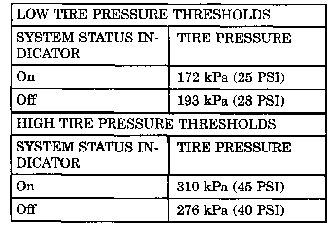 The EVIC will monitor the tire pressure signals from the four (or five) tire sensors and determine if any tire has gone below the low pressure threshold or raised above the high pressure threshold. Refer to the table.