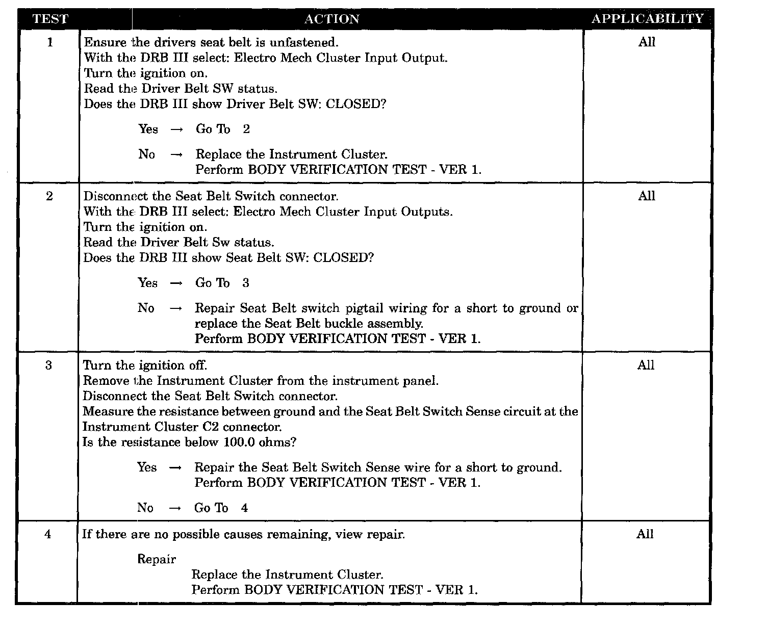 Home >> Jeep >> 2003 >> TJ (CANADA) L4-2.4L >> Repair and Diagnosis >> Powertrain Management >> Computers and Control Systems >> Relays and Modules - Computers and Control Systems >> Body Control Module >> Testing and Inspection >> Symptom Related Diagnostic Procedures >> Chime System >> Chime Inoperative With Drivers Seat Belt Unfastened