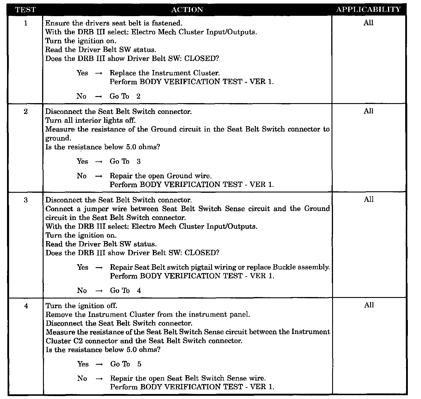 Home >> Jeep >> 2003 >> TJ (CANADA) L4-2.4L >> Repair and Diagnosis >> Powertrain Management >> Computers and Control Systems >> Relays and Modules - Computers and Control Systems >> Body Control Module >> Testing and Inspection >> Symptom Related Diagnostic Procedures >> Chime System >> Chime Sounds With Driver Seat Belt Fastened