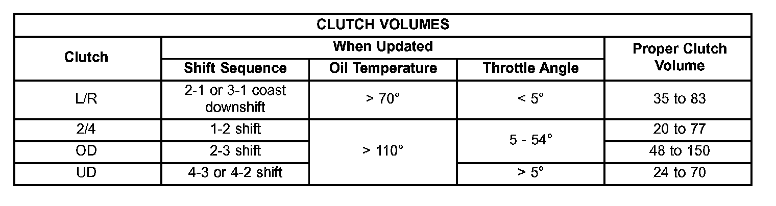 Certain mechanical problems within the input clutch assembly (broken return springs, out of position snap rings, excessive clutch pack clearance, improper assembly, etc.) can cause inadequate or out-of-range element volumes. Also, defective Input/Output Speed Sensors and wiring can cause these conditions. The following chart identifies the appropriate clutch volumes and when they are monitored/updated: