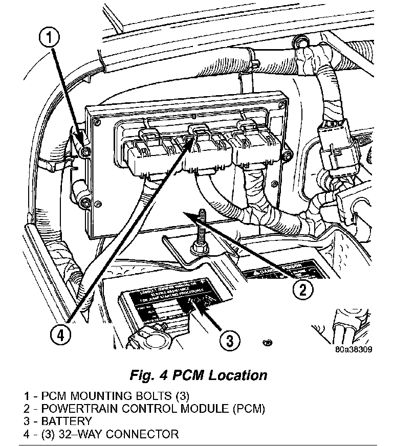 USE THE DRB SCAN TOOL TO REPROGRAM THE NEW POWERTRAIN CONTROL MODULE (PCM) WITH THE VEHICLES ORIGINAL IDENTIFICATION NUMBER (VIN) AND THE VEHICLES ORIGINAL MILEAGE. IF THIS STEP IS NOT DONE, A DIAGNOSTIC TROUBLE CODE (DTC) MAY BE SET.
