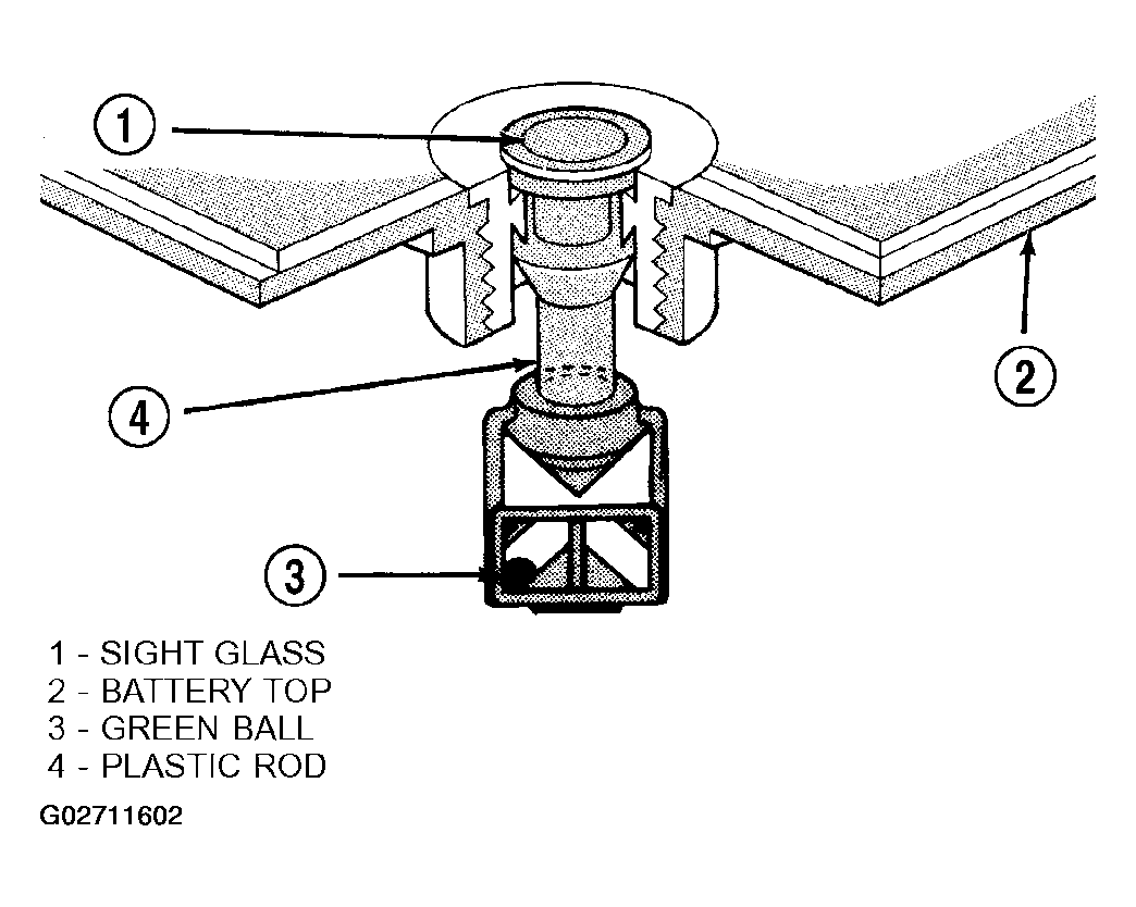 An indicator (hydrometer) built into the top of the battery case provides visual information for battery testing (Fig 1 ). Like a hydrometer, the built-in indicator measures the specific gravity of the battery electrolyte. The specific gravity of the electrolyte reveals the battery state-of-charge; however, it will not reveal the cranking capacity of the battery. A load test must be performed to determine the battery cranking capacity. Refer to STANDARD PROCEDURE for the proper battery load test procedures.