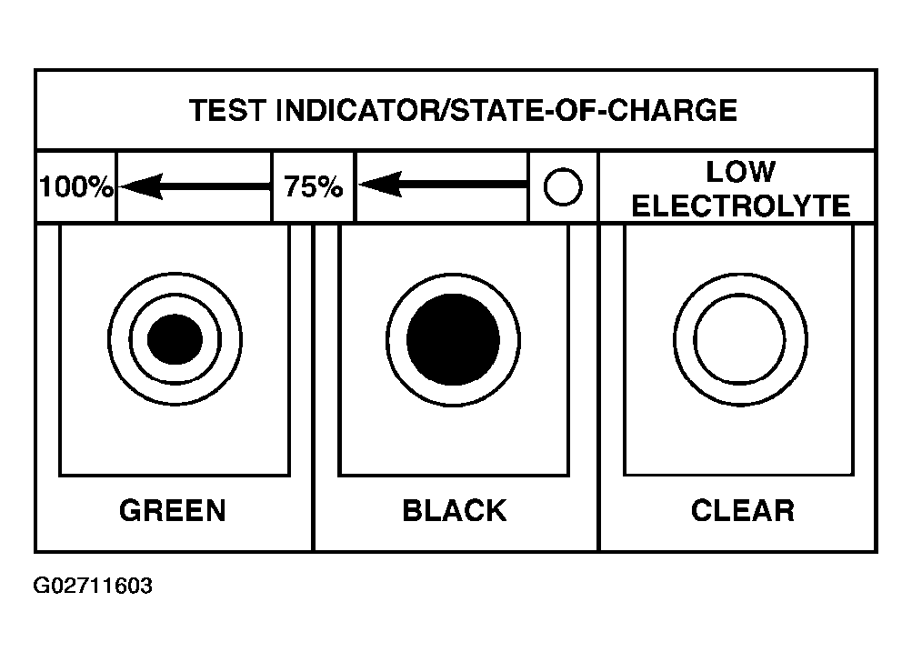 - Green - Indicates 75% to 100% battery state-of-charge. The battery is adequately charged for further testing or return to service. If the starter will not crank for a minimum of fifteen seconds with a fully charged battery, the battery must be load tested. Refer to STANDARD PROCEDURE for the proper battery load test procedures.