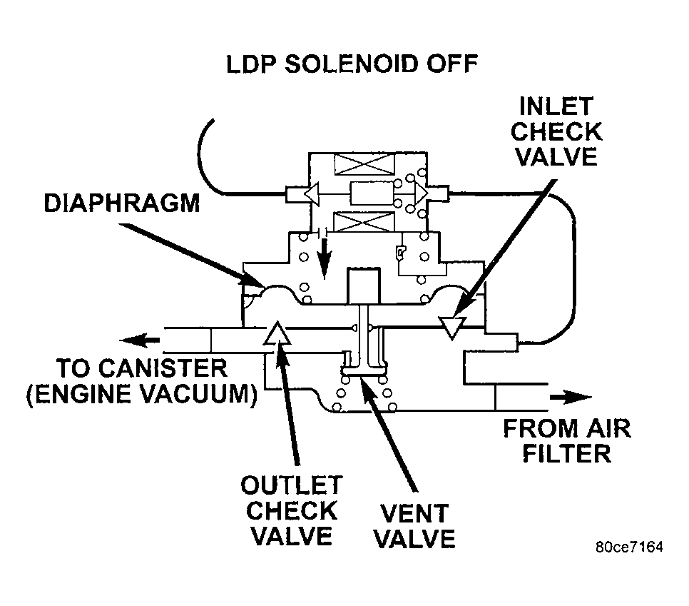 Based on reed switch input, the PCM de-energizes the LDP solenoid, causing it to block the vacuum port, and open the atmospheric port. This connects the upper pump cavity to atmosphere through the EVAP air filter. The spring is now able to push the diaphragm down. The downward movement of the diaphragm closes the inlet check valve and opens the outlet check valve pumping air into the evaporative system. The LDP reeds switch turns from open to closed, allowing the PCM to monitor LDP pumping (diaphragm up/down) activity. See Fig 1. During the pumping mode, the diaphragm will not move down far enough to open the vent valve.