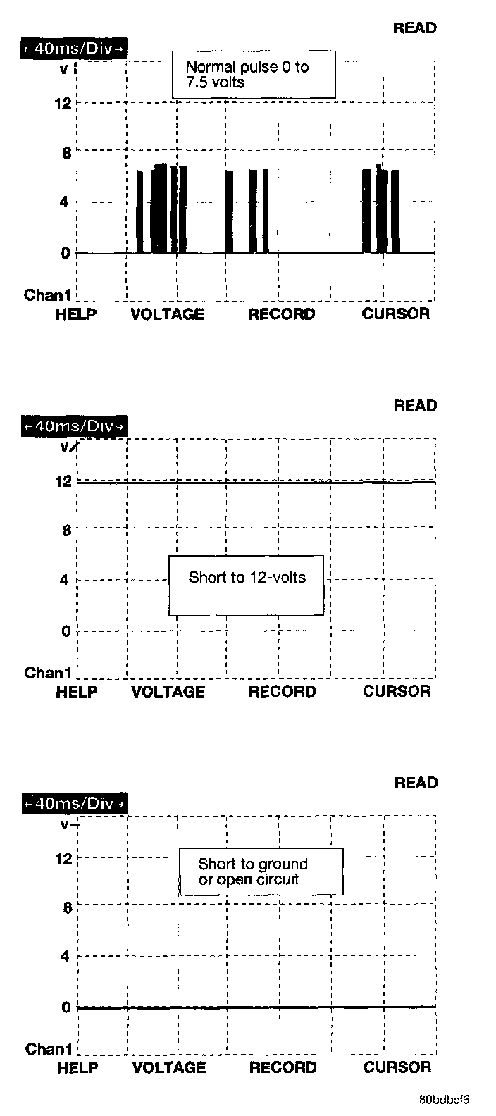 The bus messages are transmitted at a rate averaging 10800 bits per second. Since there is only voltage present when the modules transmit and the message length is only about 500 milliseconds, it is ineffective to try and measure the bus activity with a conventional voltmeter. The preferred method is to use the DRBIII(R) lab scope. The 12v square wave selection on the 20-volt scale provides a good view of the bus activity. Voltage on the bus should pulse between zero and about seven and a half volts. Refer to the image for some typical displays.