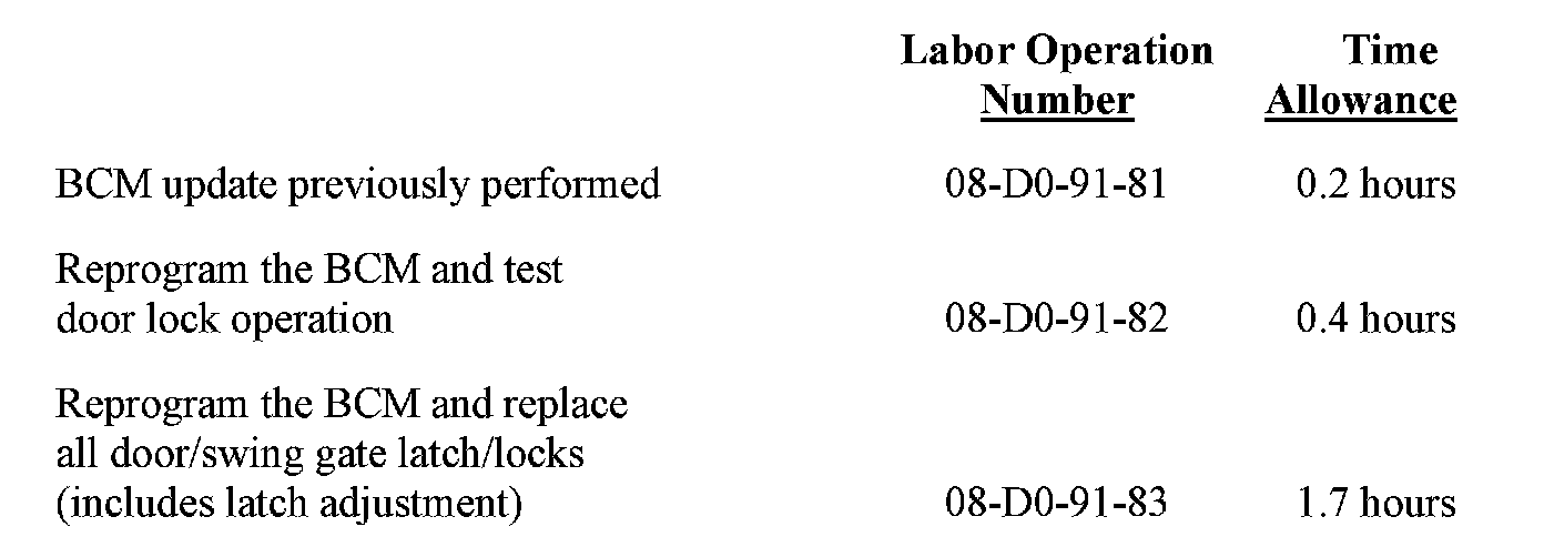 The BCM on all involved vehicles must be reprogrammed. Vehicles found with one or more inoperative lock motor must have all the door lock motors and the swing gate lock motor replaced. Very few vehicles are expected to require lock motor replacement.