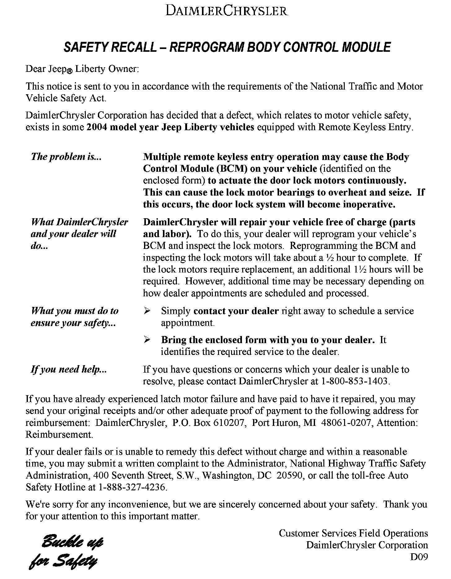 Recall - Door Lock Motor Seizure/BCM Reprogramming