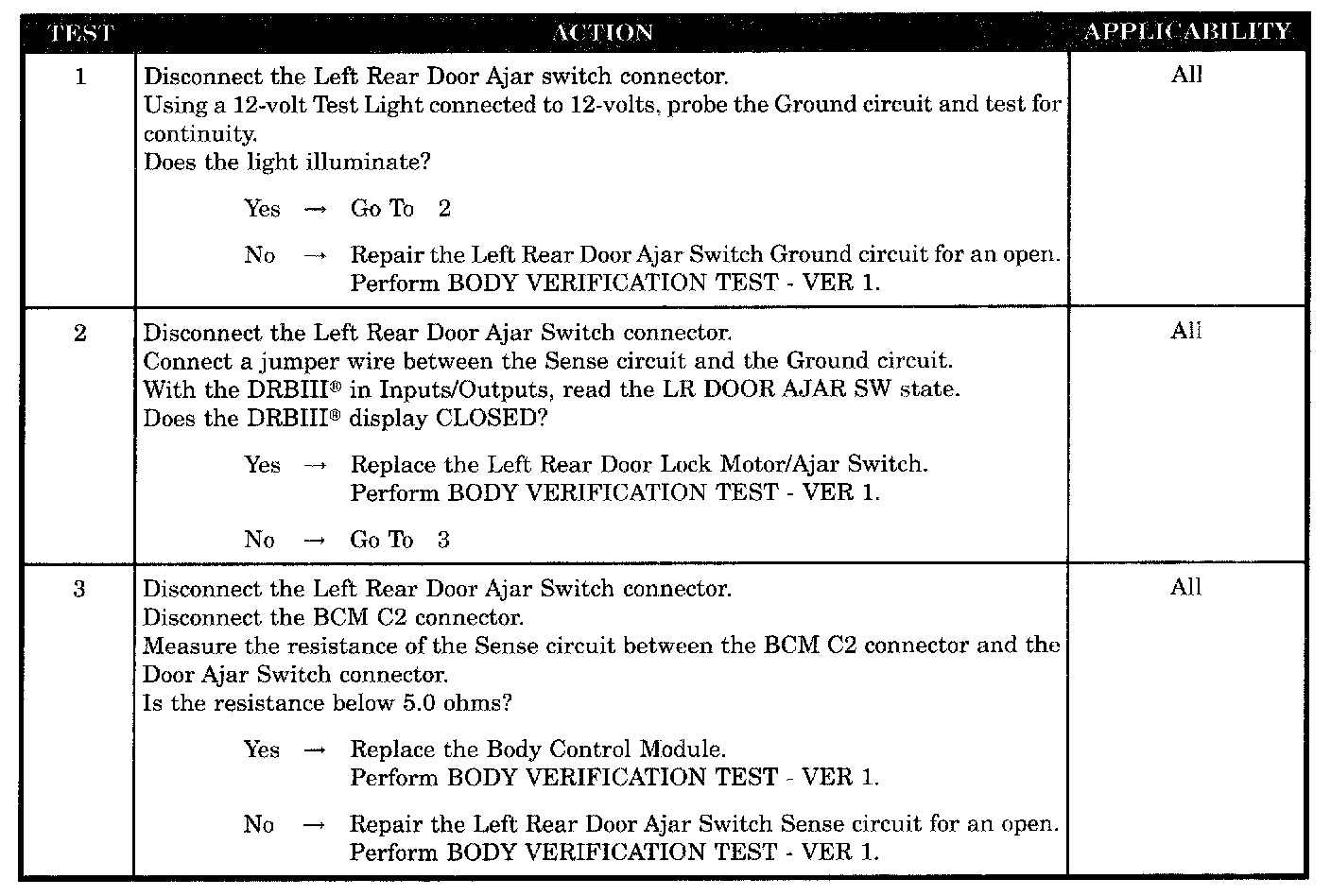 Home >> Jeep >> 2004 >> Liberty 2WD L4-2.4L VIN 1 >> Repair and Diagnosis >> Powertrain Management >> Computers and Control Systems >> Relays and Modules - Computers and Control Systems >> Body Control Module >> Testing and Inspection >> Symptom Related Diagnostic Procedures >> Door Ajar System >> Left Rear Door Ajar Circuit Open