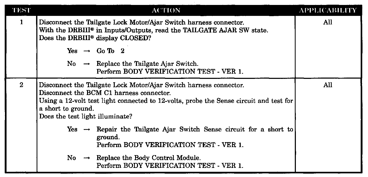 Home >> Jeep >> 2004 >> Liberty 2WD L4-2.4L VIN 1 >> Repair and Diagnosis >> Powertrain Management >> Computers and Control Systems >> Relays and Modules - Computers and Control Systems >> Body Control Module >> Testing and Inspection >> Symptom Related Diagnostic Procedures >> Door Ajar System >> Tailgate Ajar Circuit Shorted to Ground