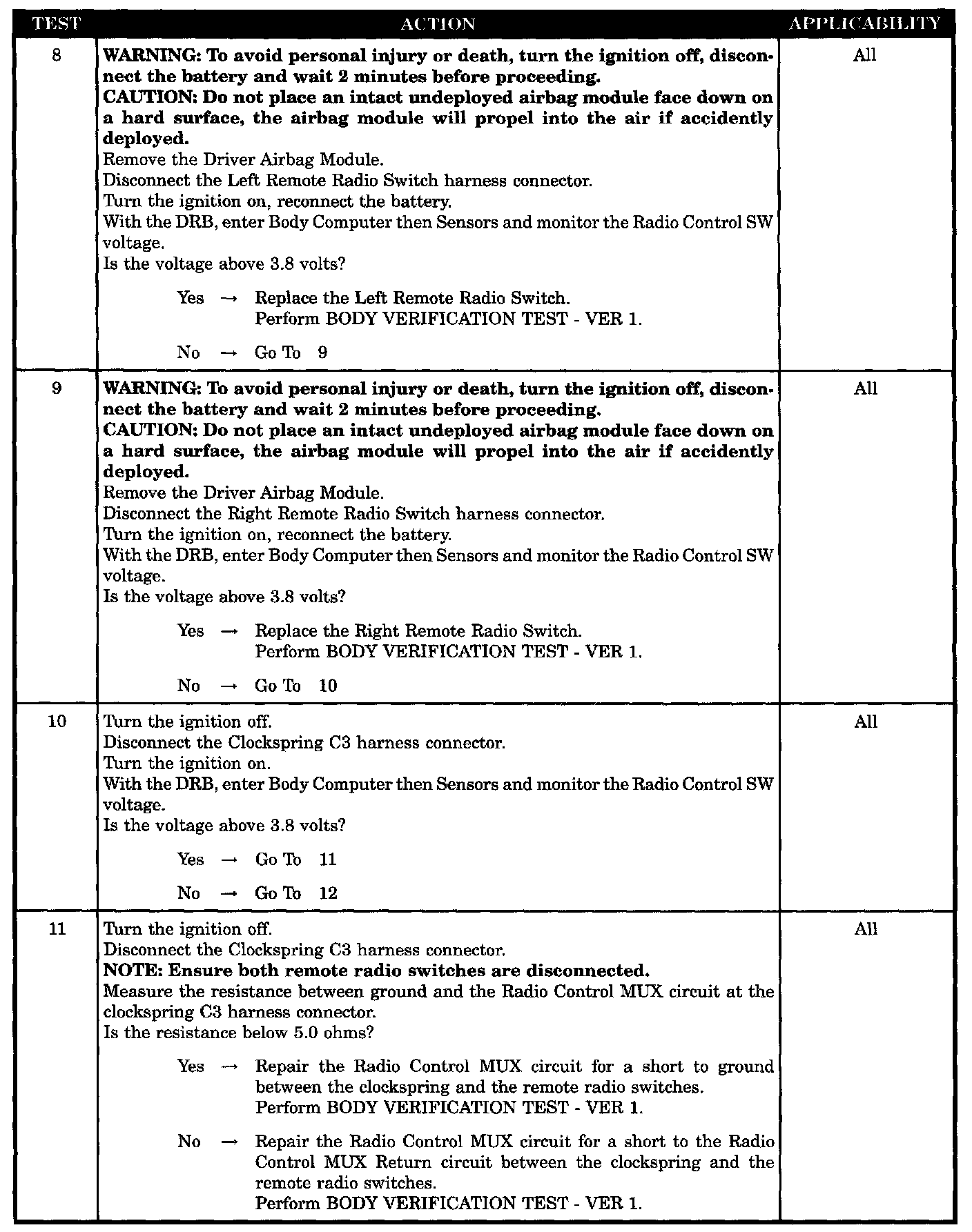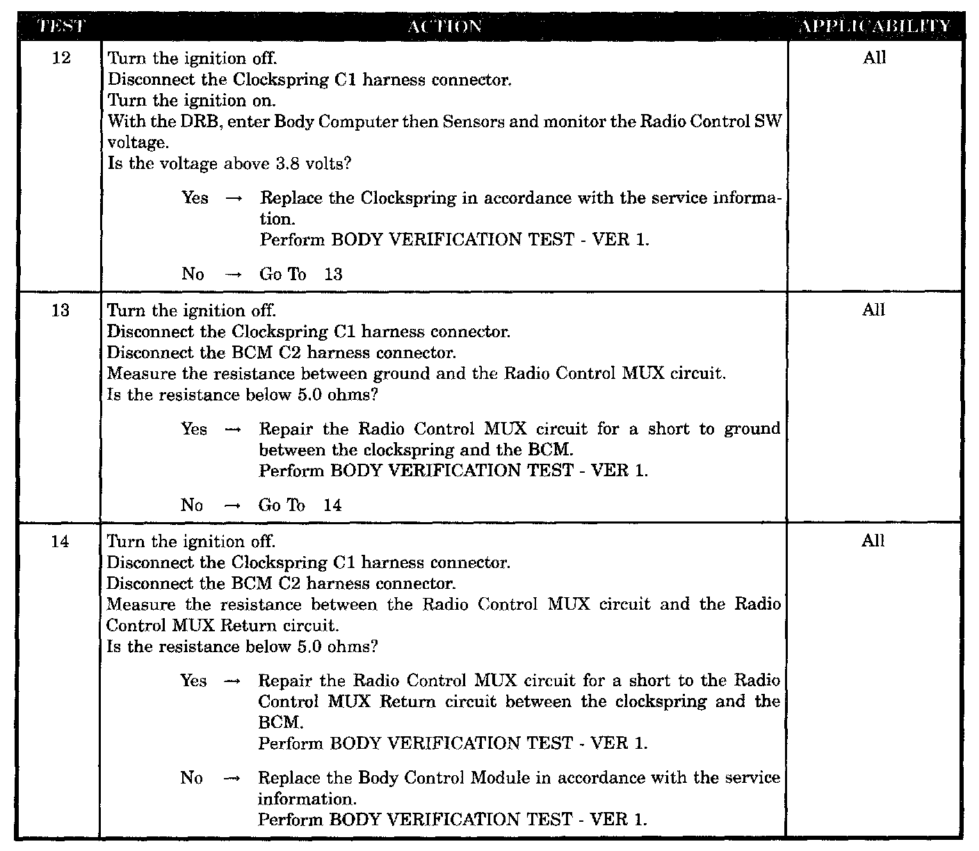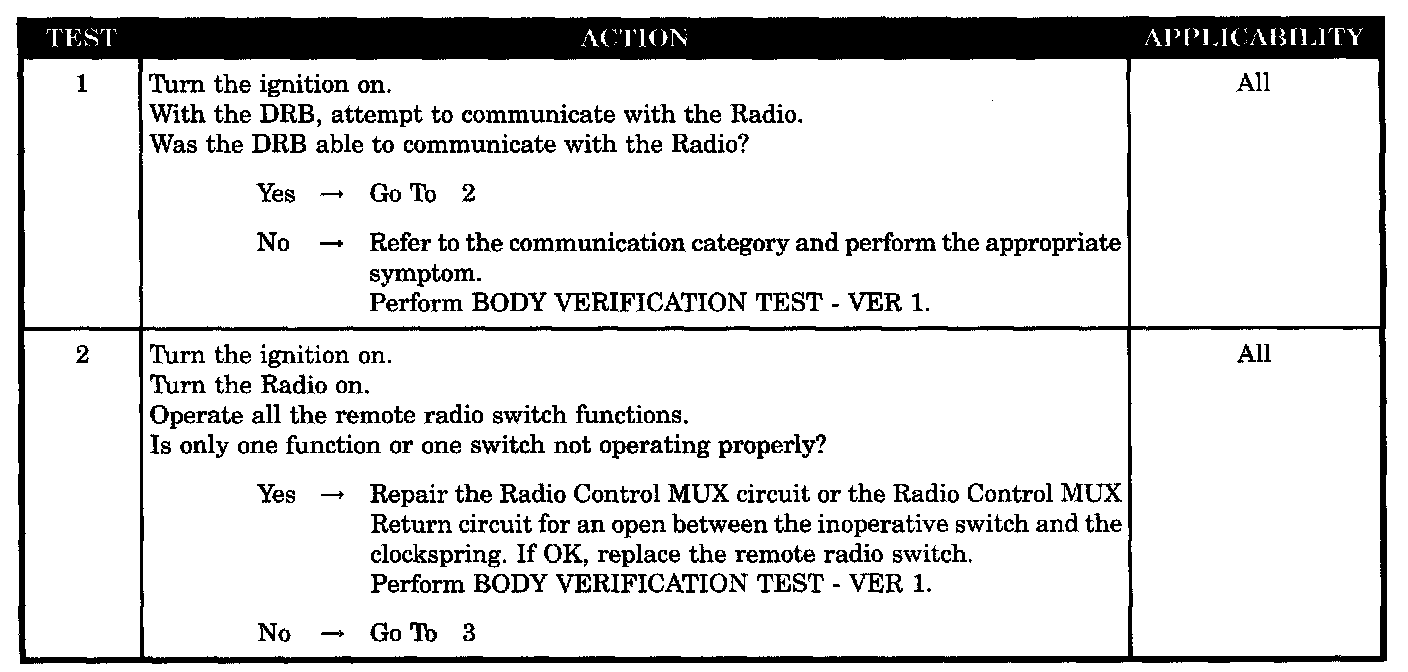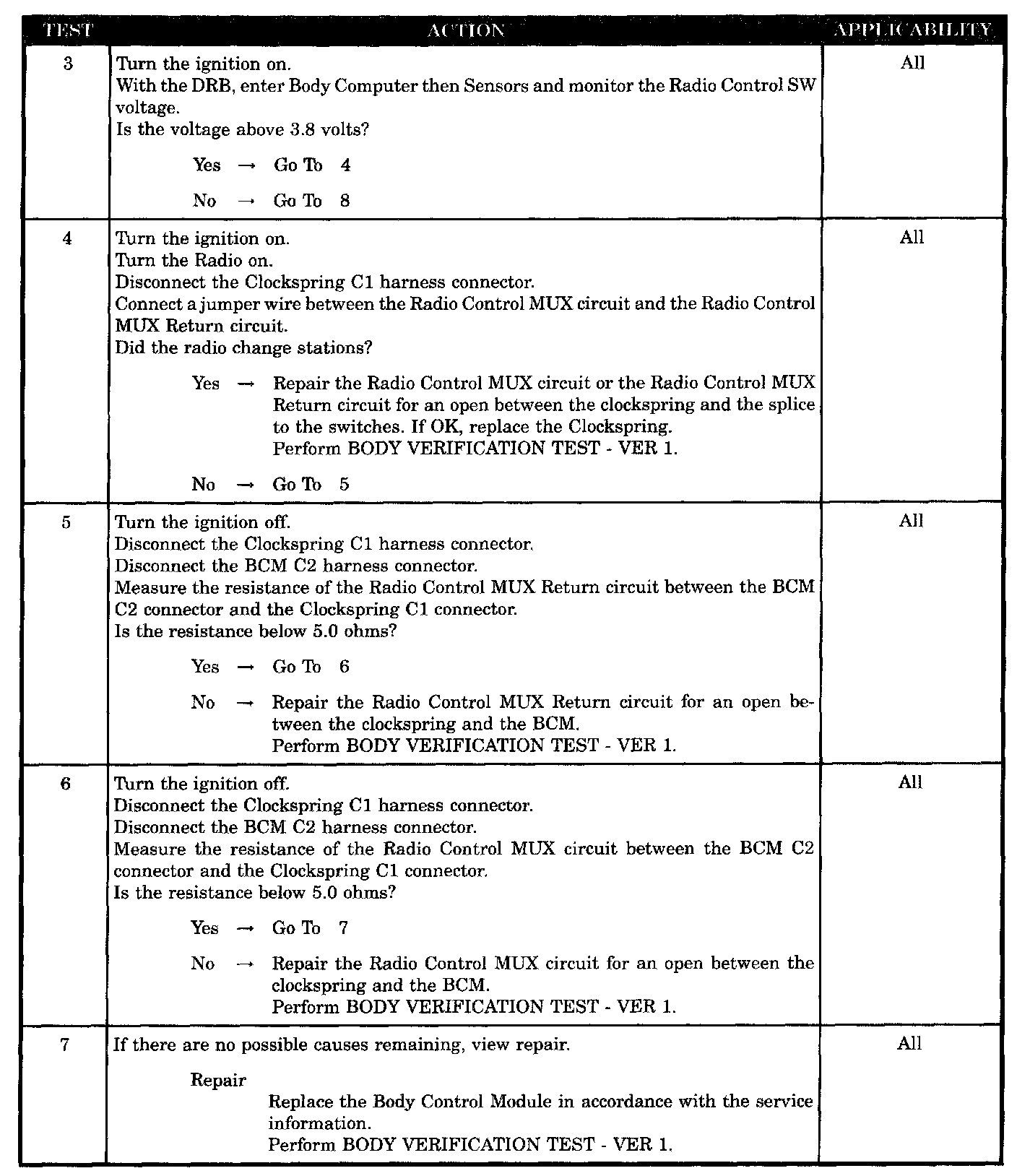 Home >> Jeep >> 2004 >> Liberty 2WD L4-2.4L VIN 1 >> Repair and Diagnosis >> Relays and Modules >> Relays and Modules - Powertrain Management >> Relays and Modules - Computers and Control Systems >> Body Control Module >> Testing and Inspection >> Symptom Related Diagnostic Procedures >> Audio System >> Remote Radio Switches Inoperative (If Equipped)