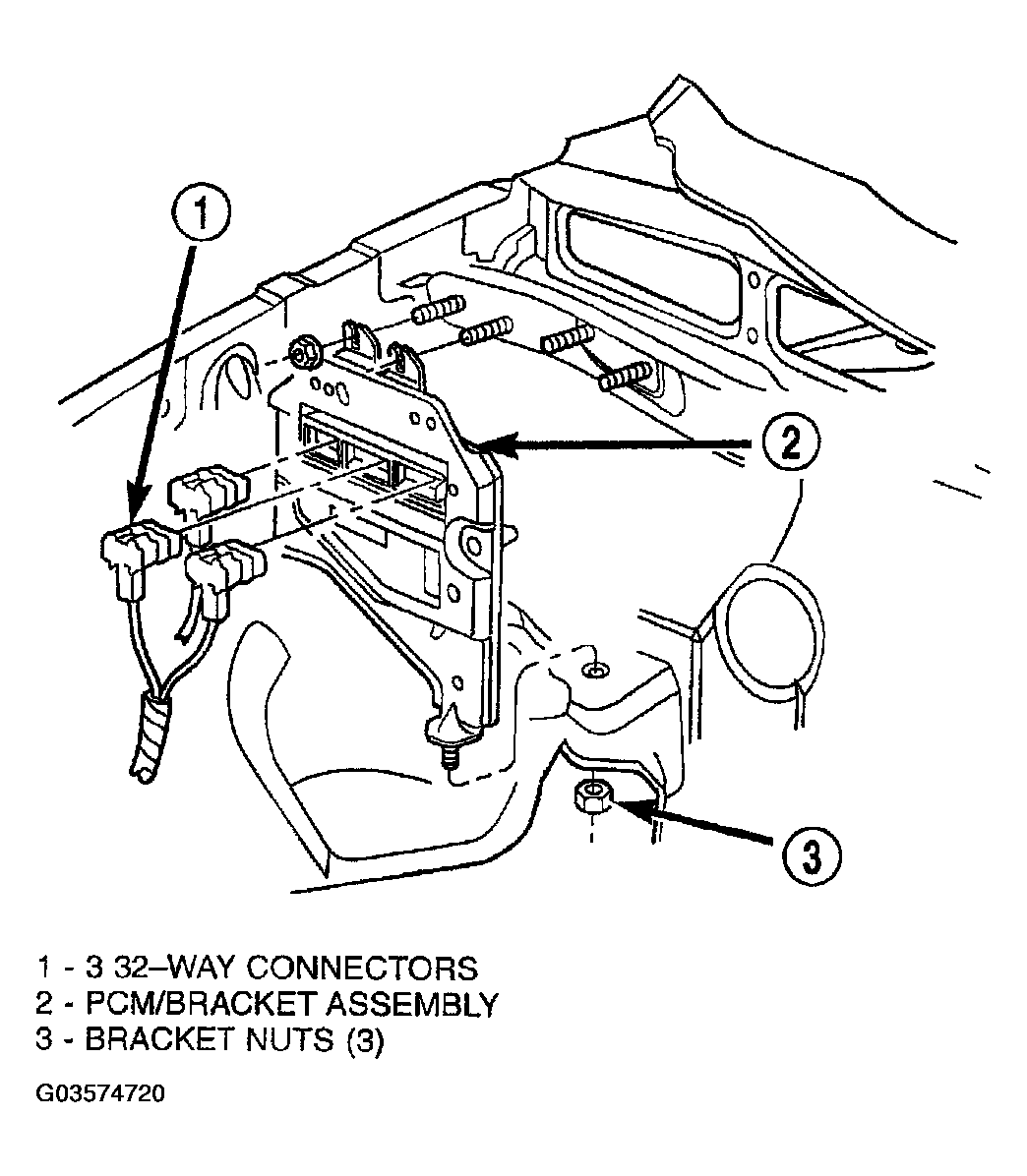 - Remove three PCM bracket-to-body mounting nuts (Fig 2 ).