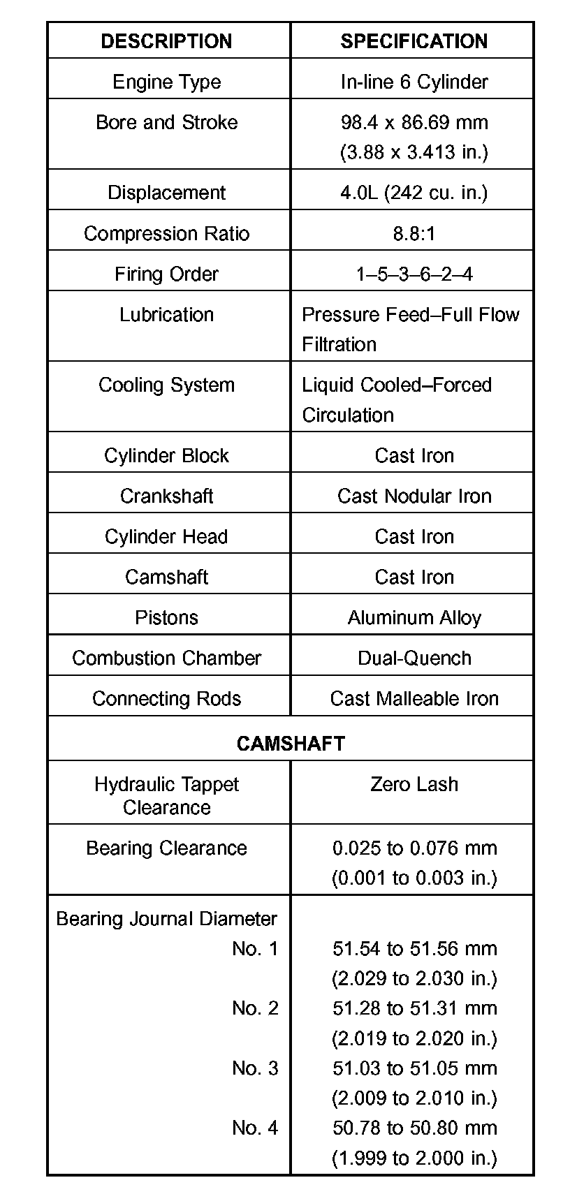 Home >> Jeep >> 2004 >> TJ (CANADA) L6-4.0L >> Repair and Diagnosis >> Specifications >> Mechanical Specifications >> Engine >> System Specifications >> Engine Specifications