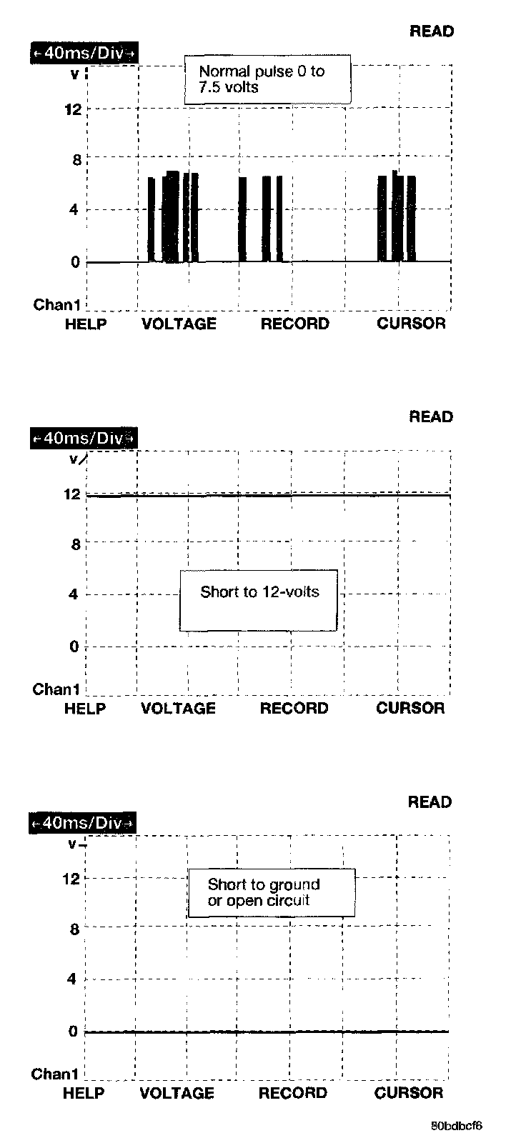 The bus messages are transmitted at a rate averaging 10800 bits per second. Since there is only voltage present when the modules transmit and the message length is only about 500 milliseconds, it is ineffective to try and measure the bus activity with a conventional voltmeter. The preferred method is to use the DRBIII(R) lab scope. The 12v square wave selection on the 20-volt scale provides a good view of the bus activity. Voltage on the bus should pulse between zero and about seven and a half volts. Refer to the following figure for some typical displays.