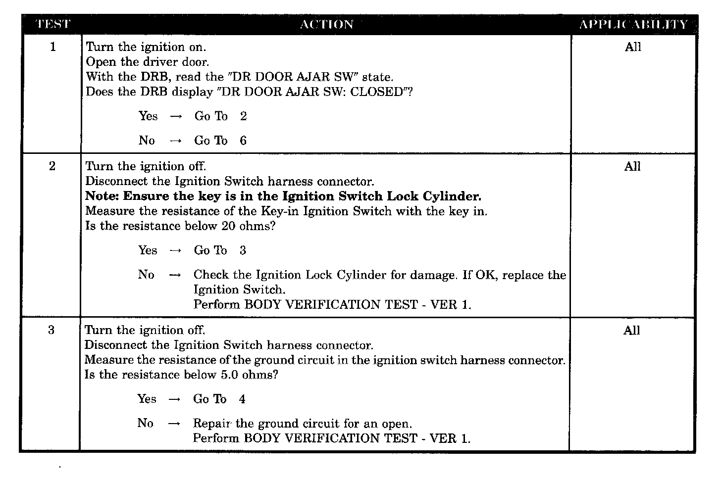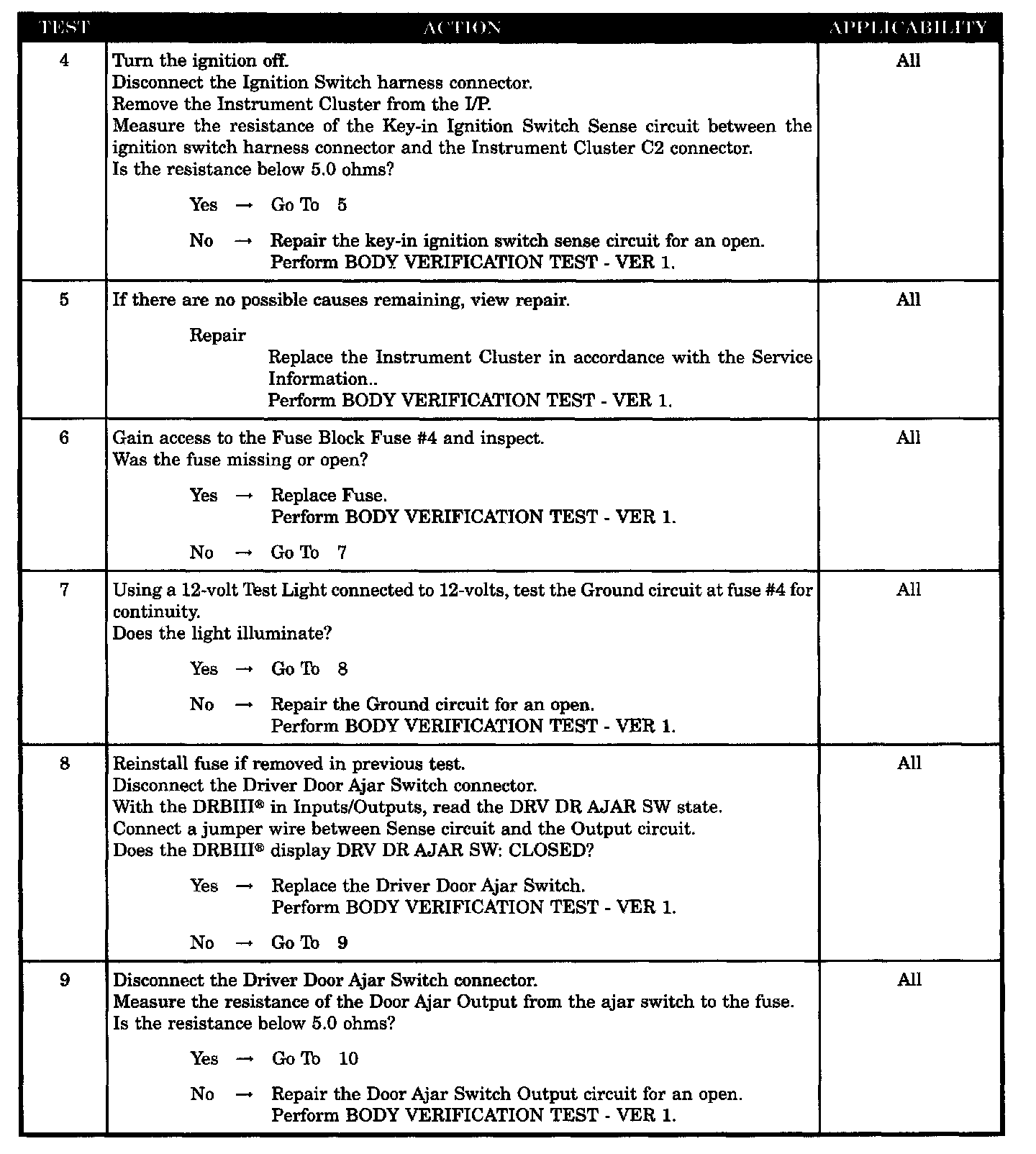 CHIME INOPERATIVE WITH KEY IN IGNITION, DRIVER'S DOOR OPEN