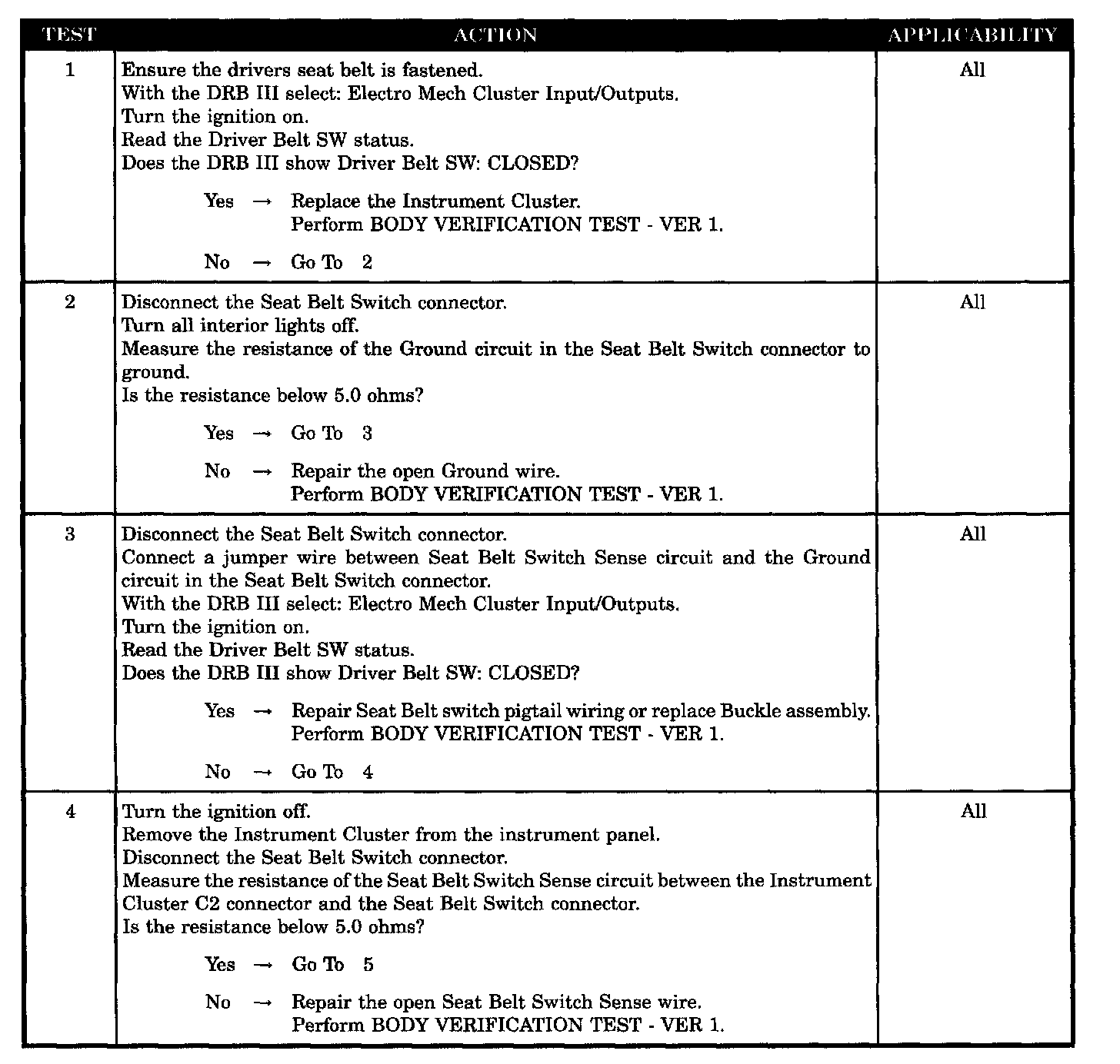 Home >> Jeep >> 2004 >> Wrangler L4-2.4L VIN 1 >> Repair and Diagnosis >> Powertrain Management >> Computers and Control Systems >> Relays and Modules - Computers and Control Systems >> Body Control Module >> Testing and Inspection >> Symptom Related Diagnostic Procedures >> Chime System >> Chime Sounds With Driver Seat Belt Fastened