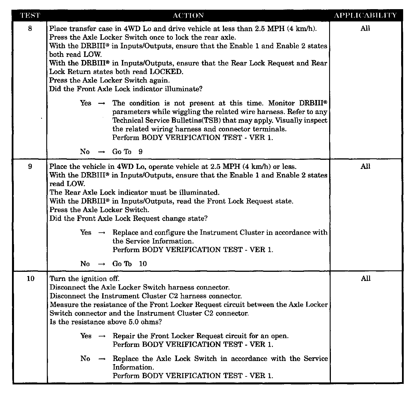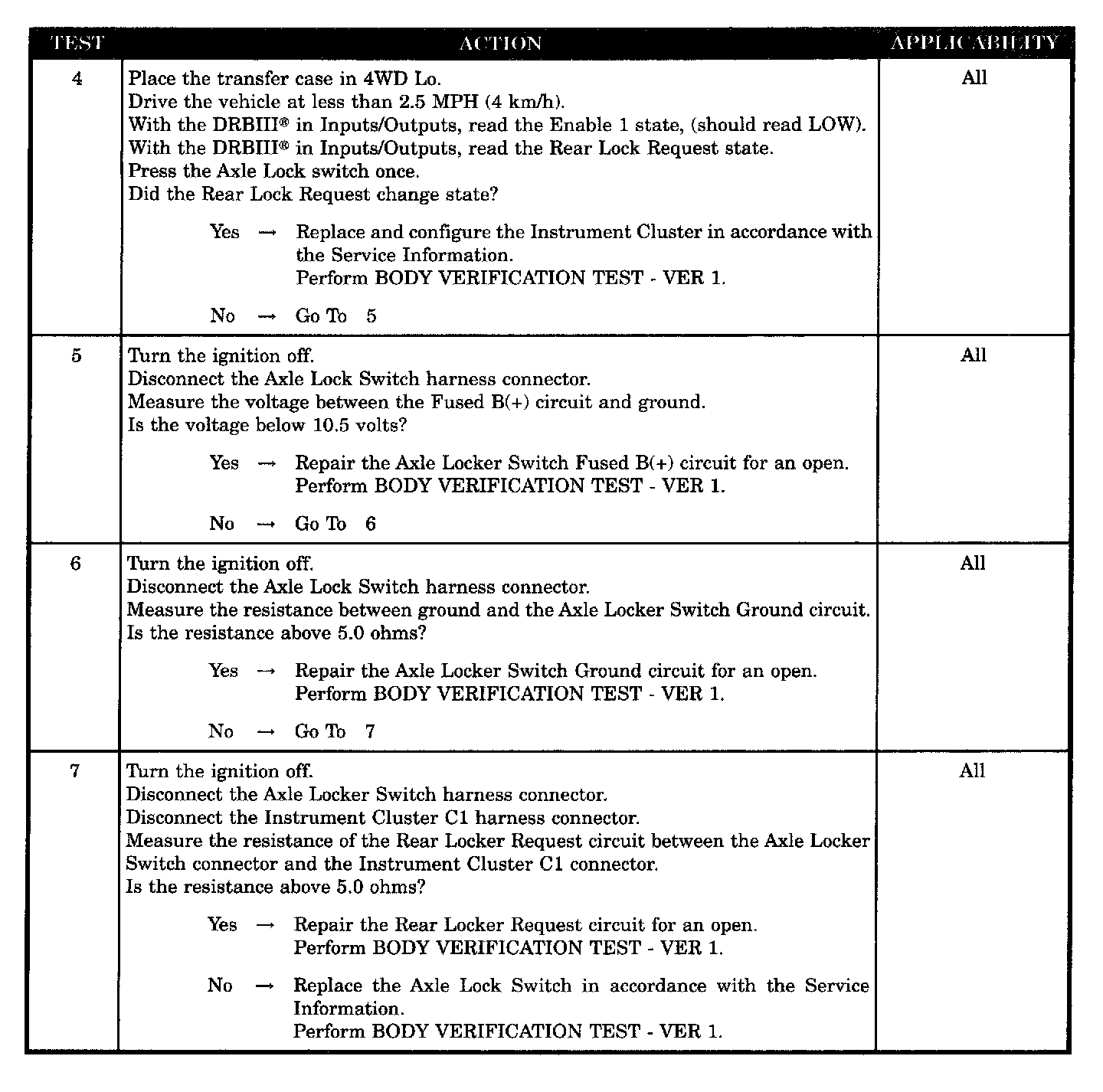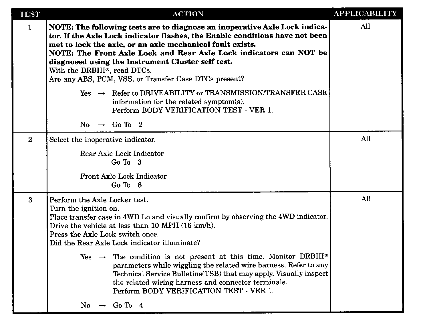 Home >> Jeep >> 2004 >> Wrangler L4-2.4L VIN 1 >> Repair and Diagnosis >> Powertrain Management >> Computers and Control Systems >> Relays and Modules - Computers and Control Systems >> Body Control Module >> Testing and Inspection >> Symptom Related Diagnostic Procedures >> Instrument Cluster >> Axle Lock Indicator Problems