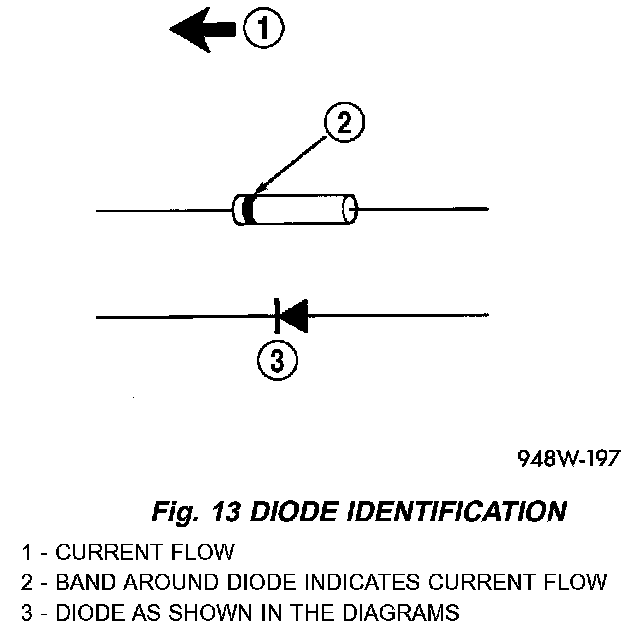 2. Install the new diode in the harness, making sure current flow is correct. If necessary, refer to the appropriate wiring diagram for current flow (Fig. 13).