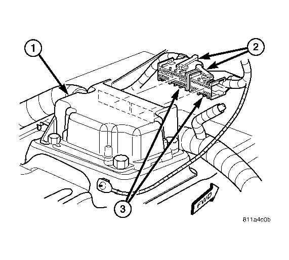 3. Reconnect the two wire harness connectors (one each from the instrument panel and the body wire harnesses) for the ACM to the ACM connector receptacles located on the forward facing side of the module. See Figure. Be certain that the latches on both connectors are each fully engaged.