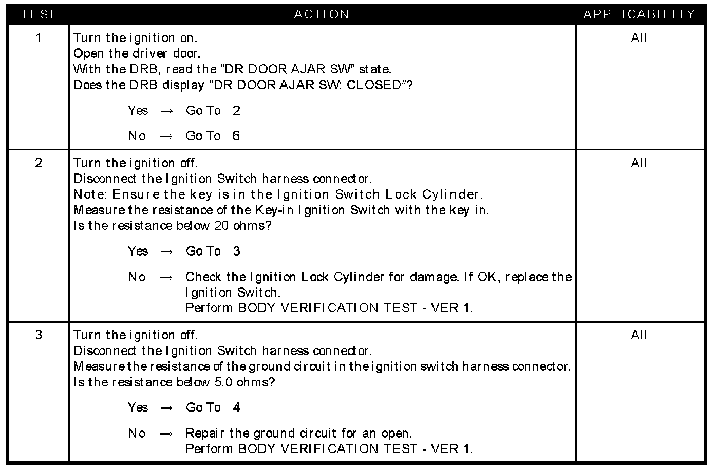 Home >> Jeep >> 2005 >> TJ (CANADA) L4-2.4L >> Repair and Diagnosis >> Powertrain Management >> Computers and Control Systems >> Relays and Modules - Computers and Control Systems >> Body Control Module >> Testing and Inspection >> Symptom Related Diagnostic Procedures >> Chime System >> Chime Inoperative With Key In Ignition and Driver's Door Open