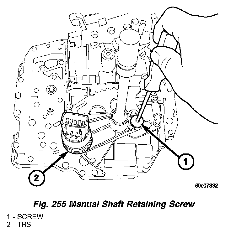 2. Install the TRS/manual shaft retaining screw (1) (Fig. 255) and torque to 5 Nm (45 inch lbs.) torque.