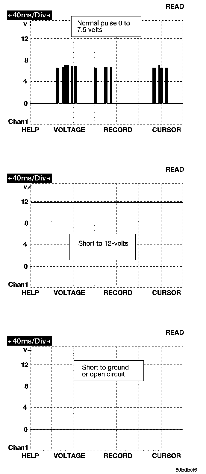 The bus messages are transmitted at a rate averaging 10800 bits per second. Since there is only voltage present when the modules transmit and the message length is only about 500 milliseconds, it is ineffective to try and measure the bus activity with a conventional voltmeter. The preferred method is to use the DRBIII(R) lab scope. The 12 v square wave selection on the 20-volt scale provides a good view of the bus activity. Voltage on the bus should pulse between zero and about seven and a half volts. Refer to the figure for some typical displays.