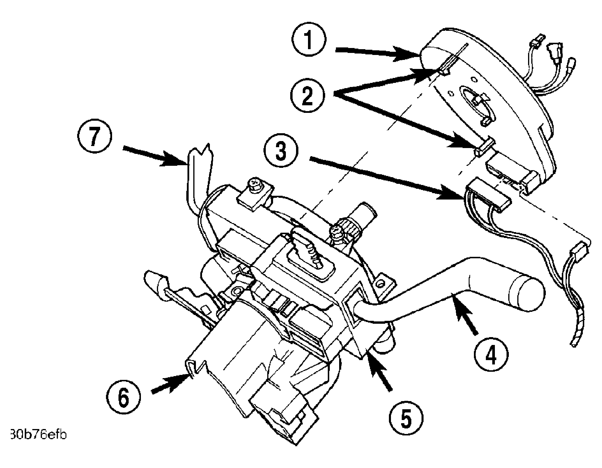 1 - CLOCKSPRING 2 - LATCHES 3 - BODY WIRE HARNESS 4 - LEFT MULTI-FUNCTION SWITCH 5 - SWITCH HOUSING 6 - STEERING COLUMN 7 - RIGHT MULTI-FUNCTION SWITCH - Using a small screwdriver, gently pry both plastic latches that secure the clockspring away from the steering column upper housing far enough to pull the clockspring away from the upper housing.NOTE: If the clockspring plastic latches are broken, be certain to remove the broken pieces from the steering column upper housing.