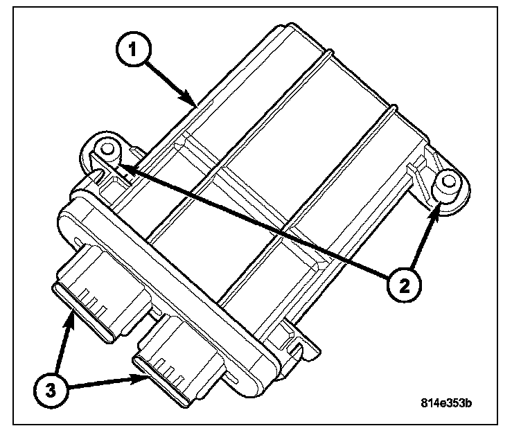 The Occupant Classification Module (OCM) (1) is secured with two screws to a mount integral to the passenger side front seat riser frame under the seat cushion near the inboard front corner. Concealed within a hollow in the center of the molded plastic OCM housing is a microprocessor and the other electronic circuitry of the module. The module housing is sealed to enclose and protect the internal electronic circuitry. The OCM software is flash programmable. Two mounting tabs (2) and two connector receptacles (3) are integral to the OCM housing. The connector receptacles contain terminal pins that connect the OCM to the vehicle electrical system through a dedicated take out and connector of the passenger side front seat wire harness, and a second take out and connector of the body wire harness.