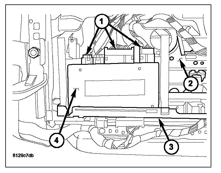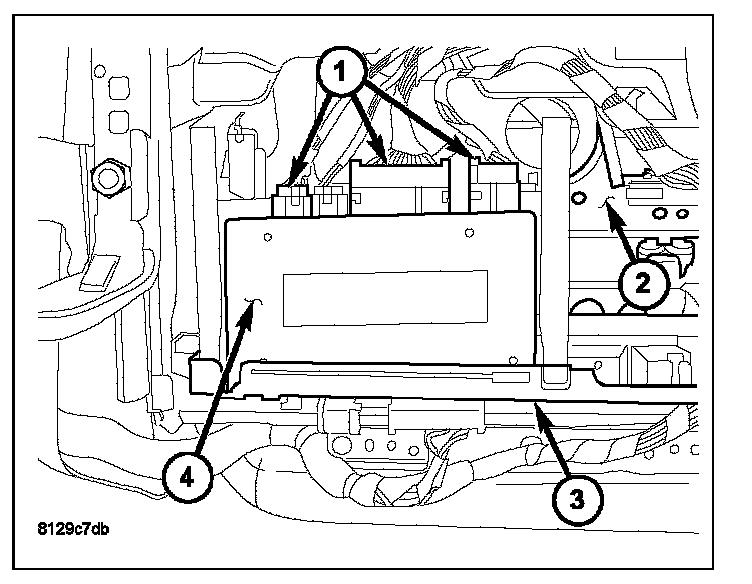 1. Place the module (4) into position making sure the mounting tabs are properly aligned with the front bracket.