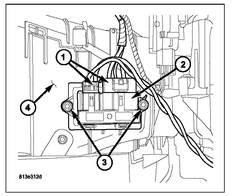 5. Remove the two screws (3) that secure the blower motor power module to the HVAC housing (4).