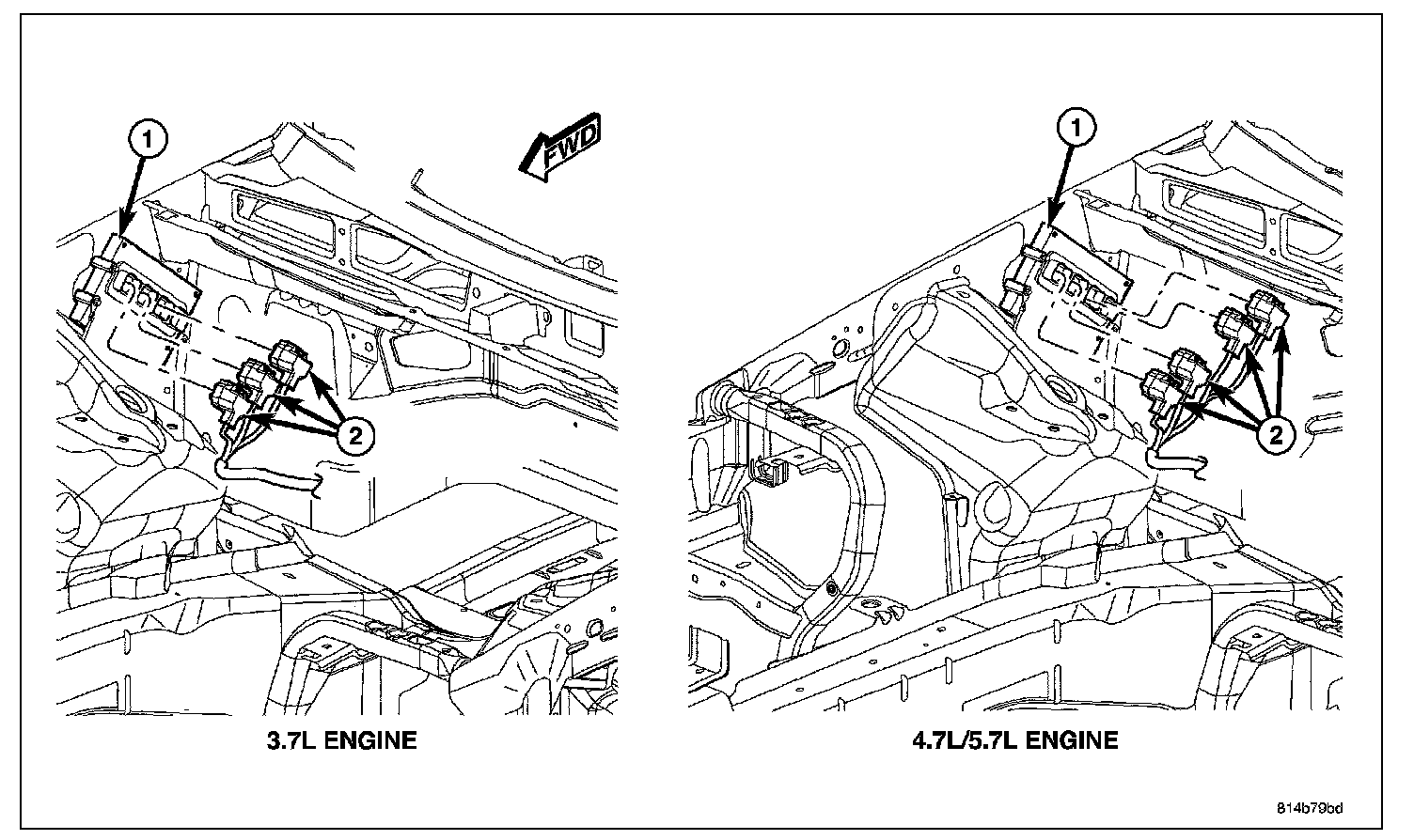 The PCM (1) is attached to the right-front inner fender located in the engine compartment.