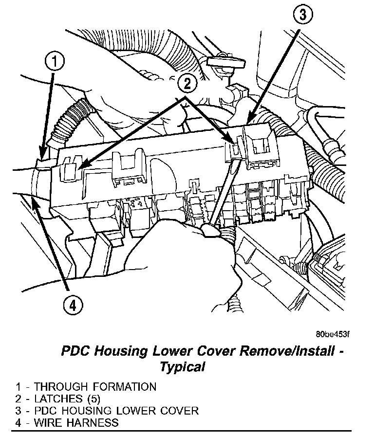 The Power Distribution Center (PDC) cover, the PDC housing lower cover, the PDC relay wedges, the PDC relay cassettes and the PDC B(+) terminal stud module are available for service replacement. The PDC cover can be simply unlatched and removed from the PDC housing without the PDC being removed or disassembled. Service of the remaining PDC components requires that the PDC be removed from its mounting and disassembled.