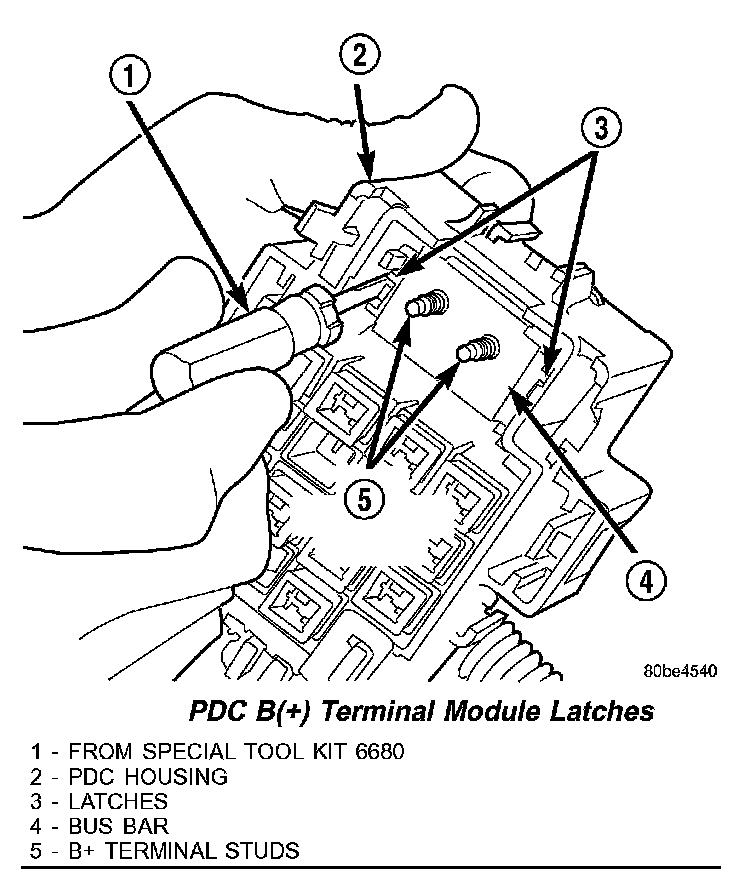 2. From the top of the PDC housing, use a small screwdriver or a terminal pick tool (Special Tool Kit 6680) to release the two latches that secure the B(+) terminal module in the PDC.