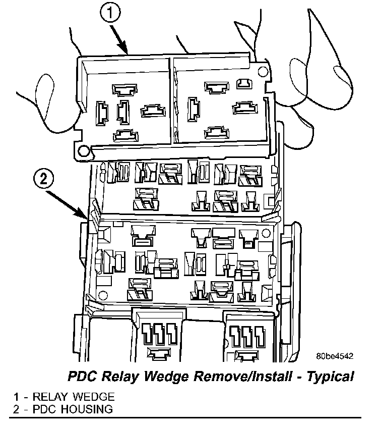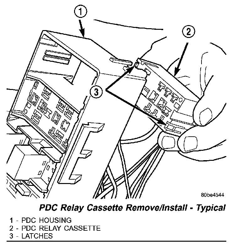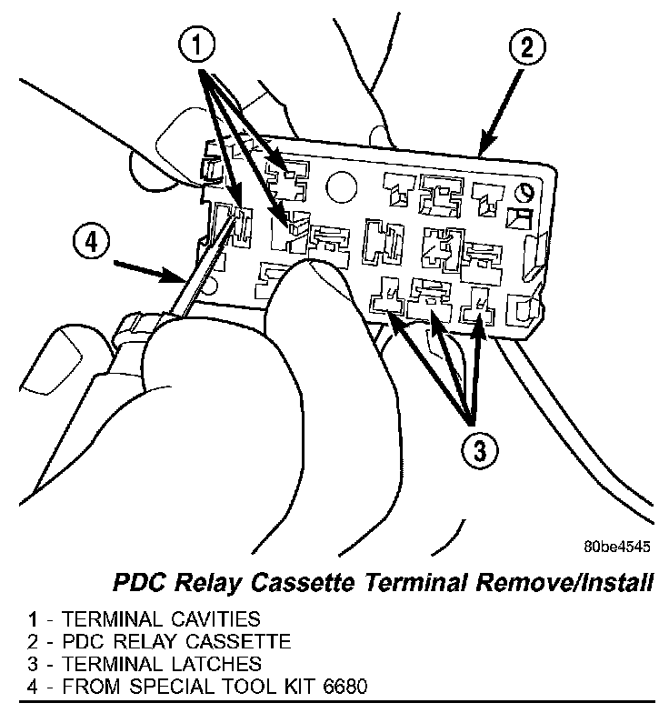 CAUTION: Proper care must be taken to be certain that the wiring and terminals from the faulty PDC relay cassette are installed in the correct terminal cavities of the replacement relay cassette. To prevent mistakes it is recommended that the wiring and terminals be removed from the faulty relay cassette one cavity at a time, repaired or spliced as necessary, then installed securely into the correct cavity of the replacement relay cassette. If you are not absolutely certain into which cavity a terminal should be installed, refer to Power Distribution for the location of complete PDC wiring diagrams.