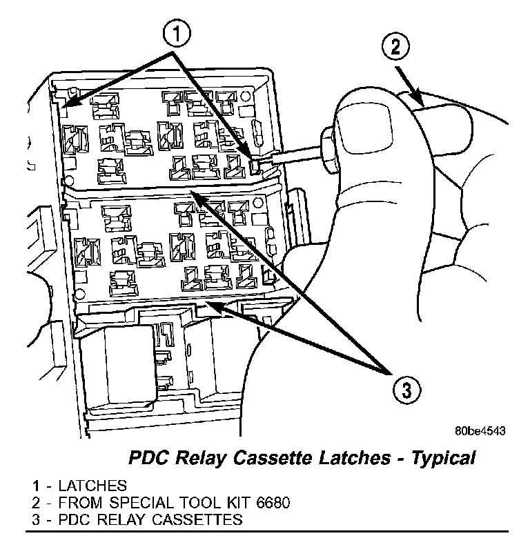 2. From the top of the PDC housing, use a small screwdriver or a terminal pick tool (Special Tool Kit 6680) to release the two latches that secure the relay cassette in the PDC.