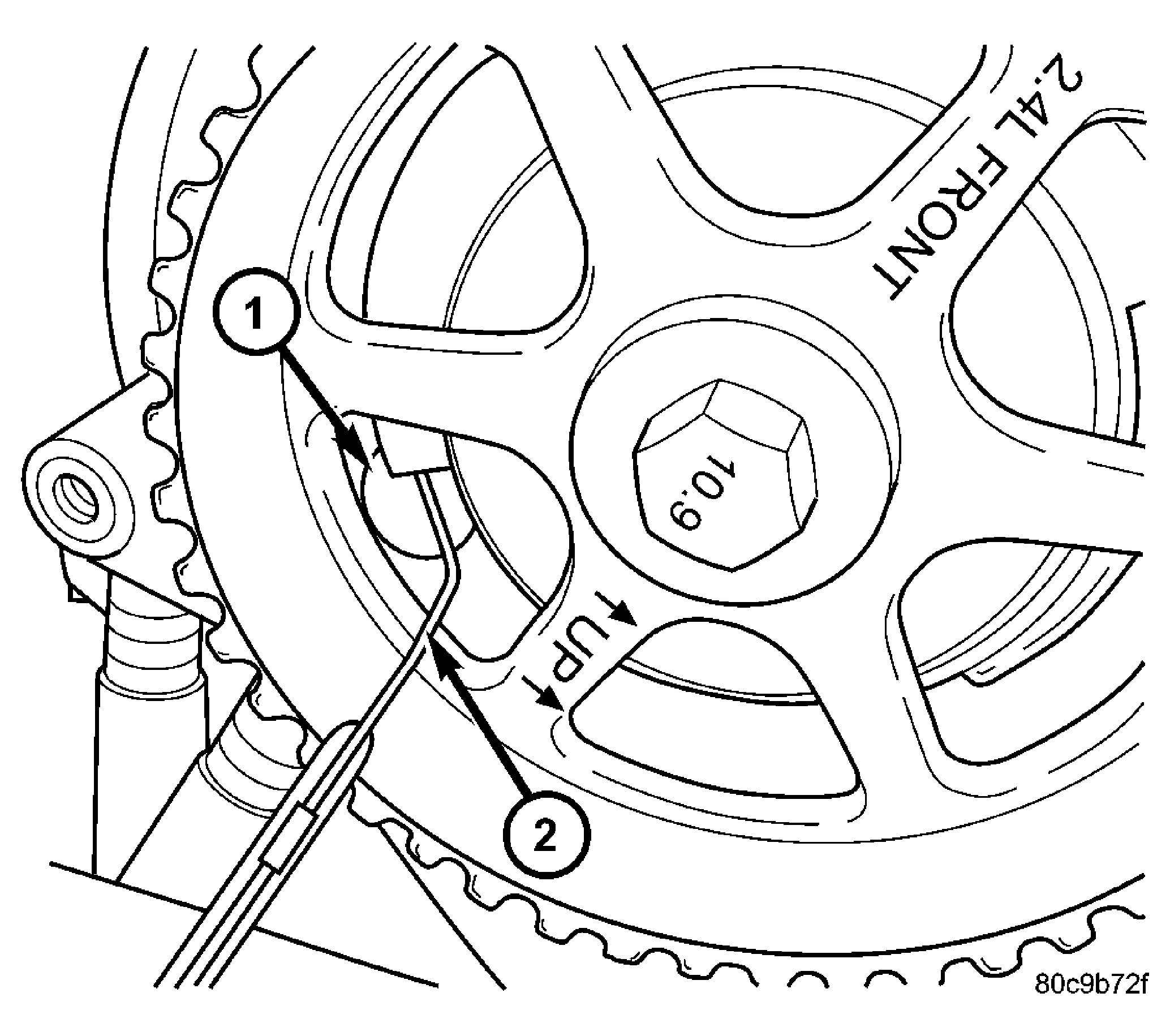 - Rotate (bump over) engine until camshaft timing gear and target wheel (tonewheel) are positioned and aligned to face of sensor as shown in Fig 2. If not positioned as shown in Fig 2 , damage to both sensor and target wheel will occur when attempting to start engine. Face of sensor MUST be behind target wheel while adjusting.