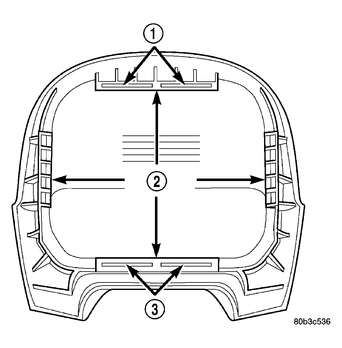 1 - HORN SWITCH GROUND PIGTAIL WIRE 2 - NUT (4) 3 - HORN SWITCH FEED PIGTAIL WIRE - Remove the upper and lower trim cover retainers from the airbag housing studs. See Fig 2.
