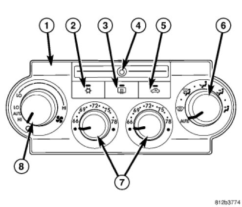 The A/C-heater control (1) for the automatic temperature control (ATC) dual zone heating-A/C system allows both the driver and the front seat passenger the ability to individually regulate air temperature for their side of the vehicle. All controls are identified by ISO graphic symbols.