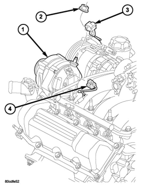 4. Install B+ terminal eyelet to generator output stud. Tighten mounting nut (2) to 108 in. lbs. (12 Nm).