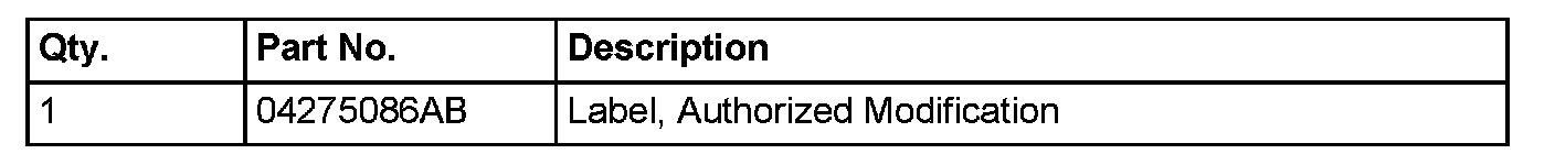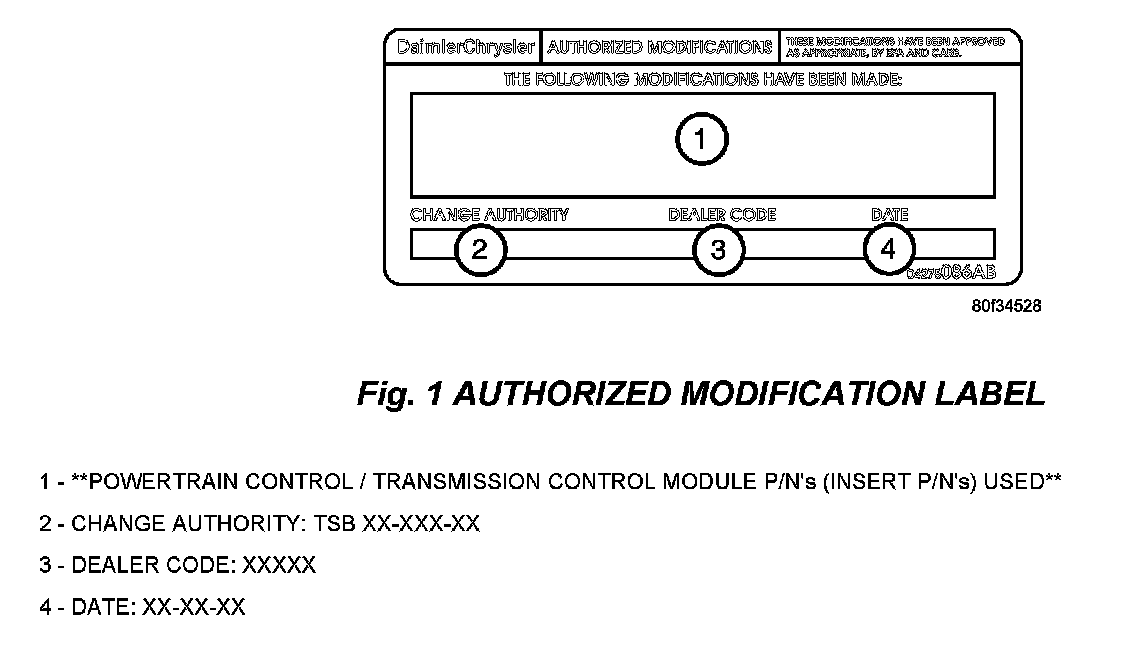 17. Type the necessary information on the "Authorized Modification Label" p/n 04275086AB and attach near the VECI label (Fig 1).
